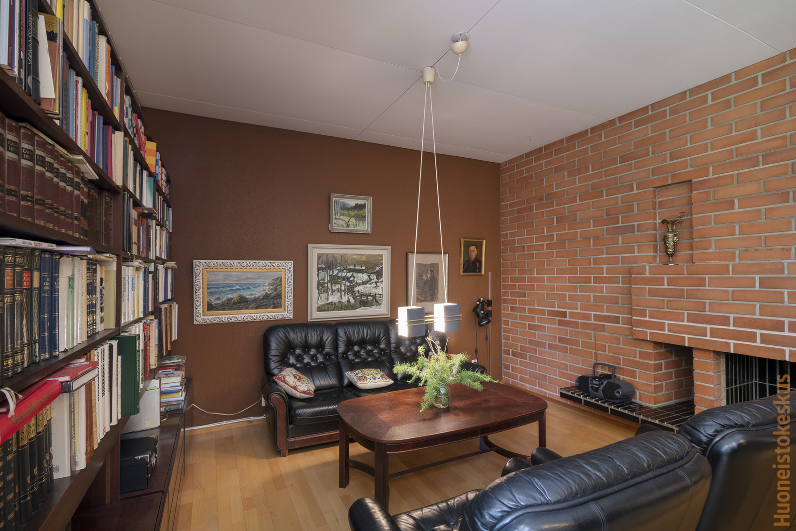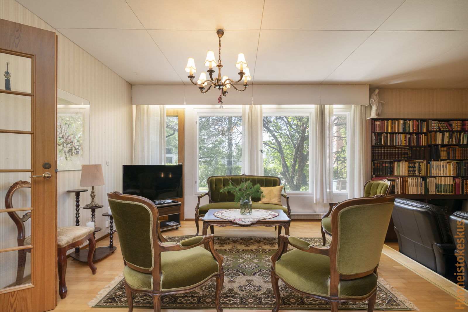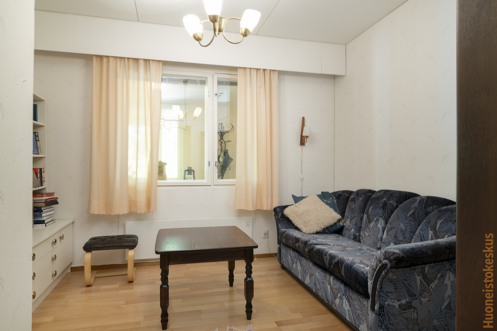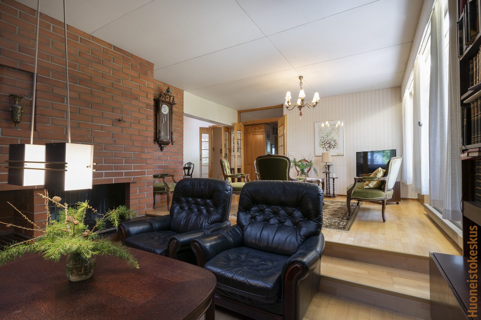| Olohuoneen kuvaus | Seinät (tapetti), lattiat (parketti), Olohuoneen yhteydessä takkanurkkaus (avotakka). |