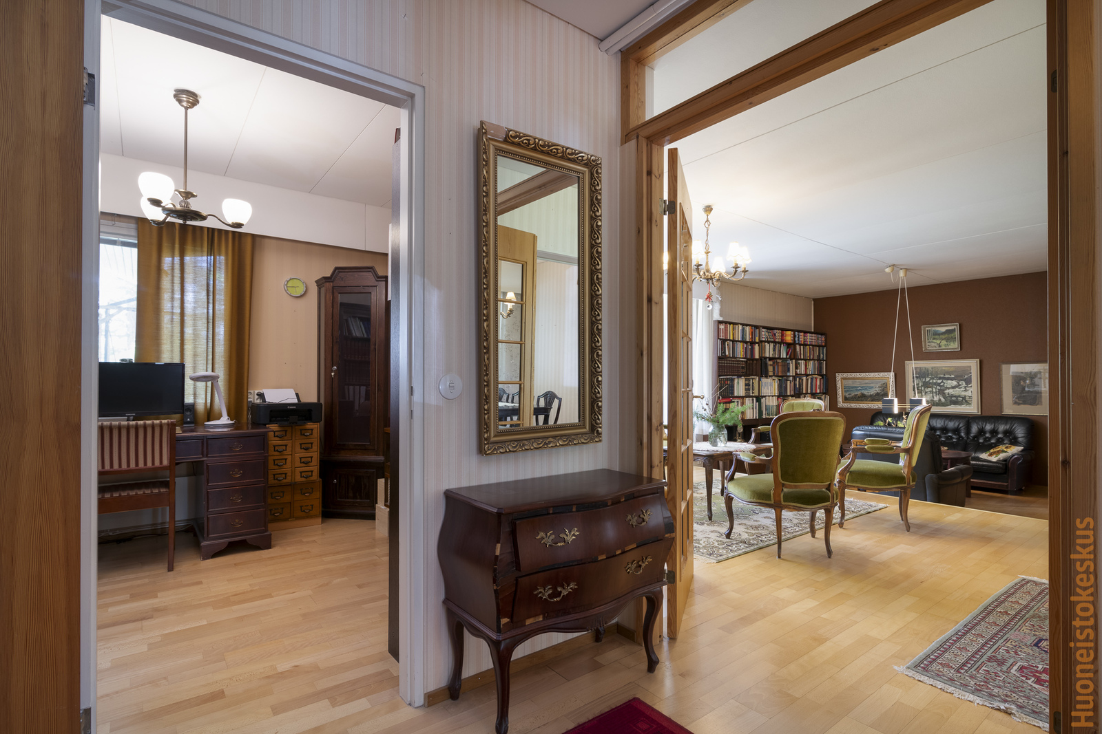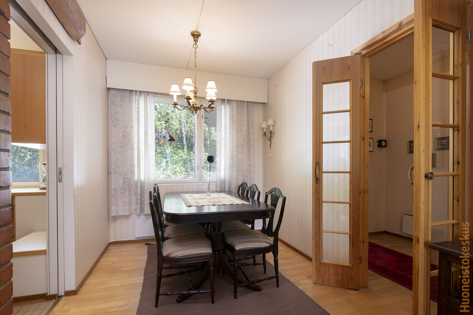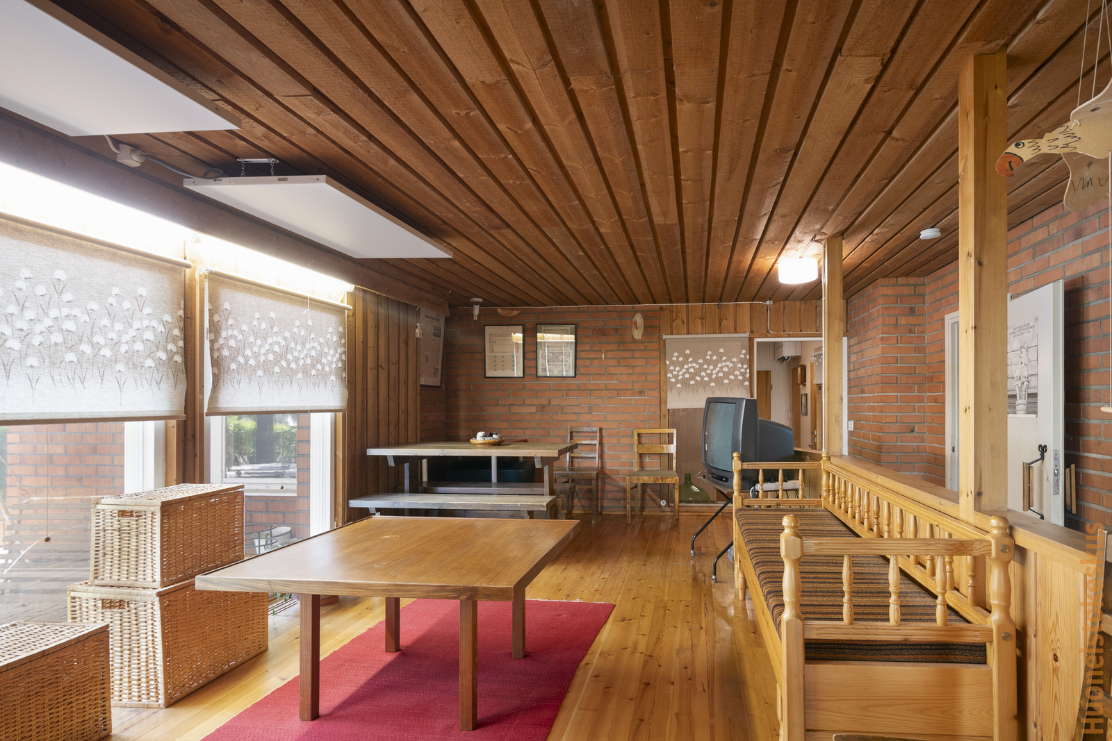 | Olohuoneen kuvaus | Seinät (tapetti), lattiat (parketti), Olohuoneen yhteydessä takkanurkkaus (avotakka). |