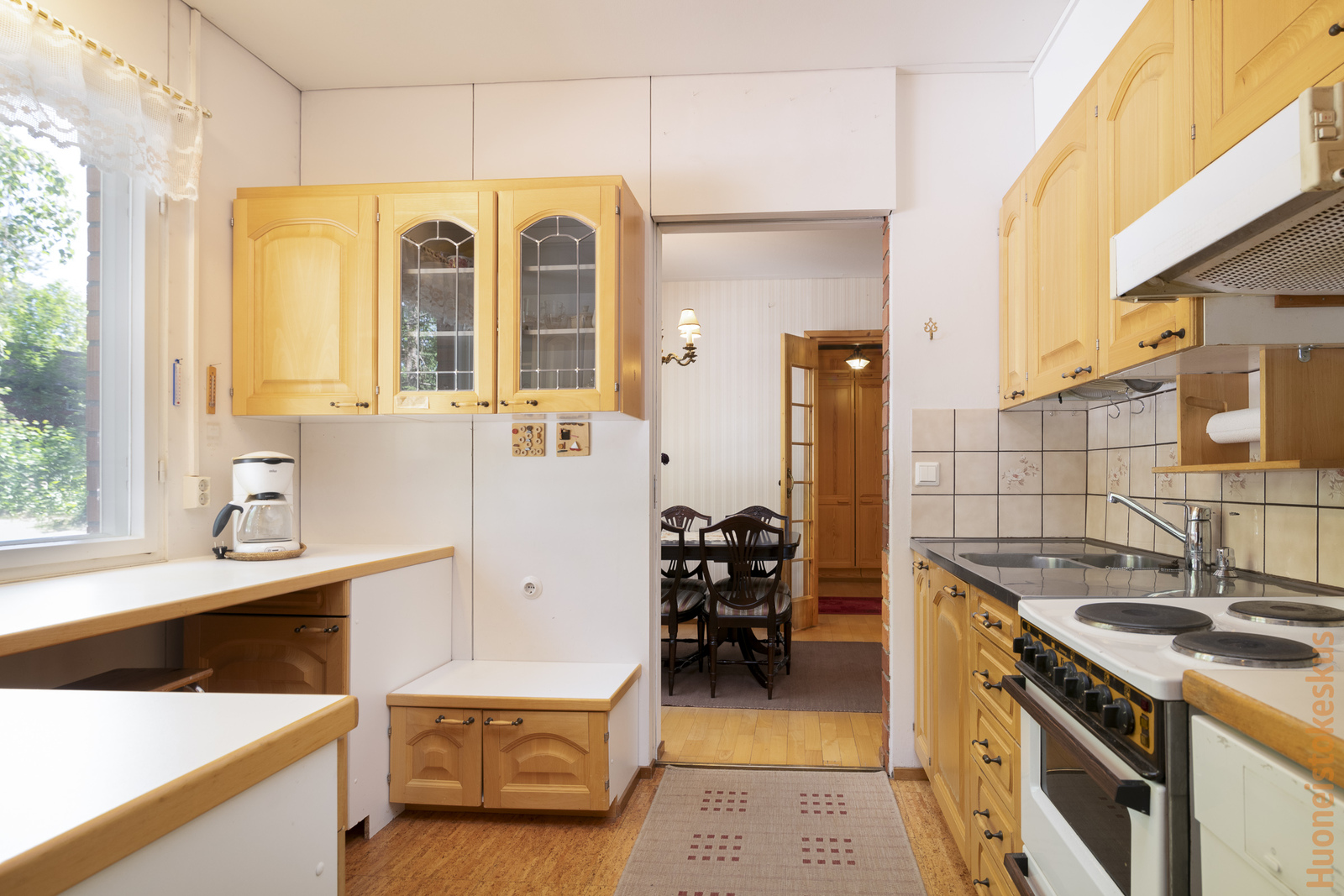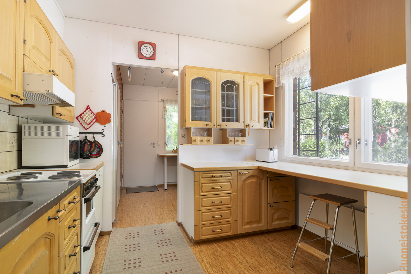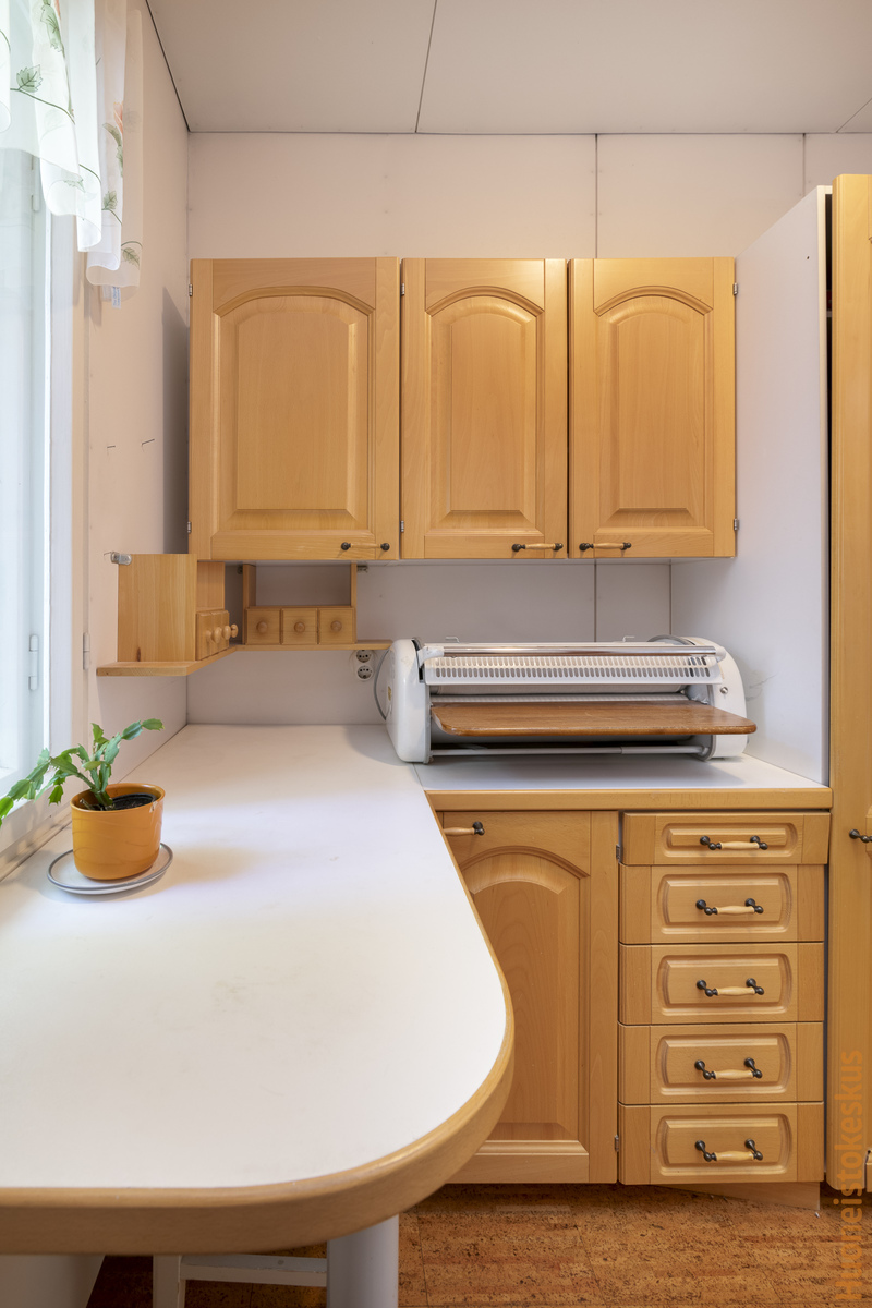 | Keittiön kuvaus | Liesi (Sähköhella), työtasot (laminaatti), seinät (maali ja tapetti), lattiat (parketti ja korkki), jääkaappi, liesi, liesituuletin, astianpesukone ja kiinteät valaisimet |
