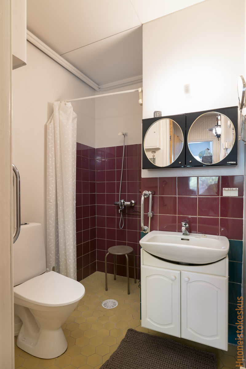 | Kylpyhuoneen kuvaus | Pesukoneliitäntä, suihku ja kiinteät valaisimet, seinät (maali ja kaakeli), lattiat (laatta) |