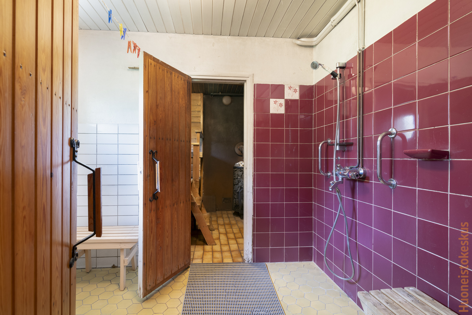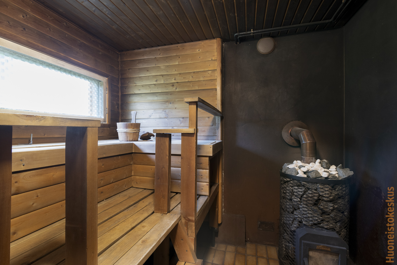 | Saunan kuvaus | Seinät (paneeli), lattiat (laatta), Puukiuas |