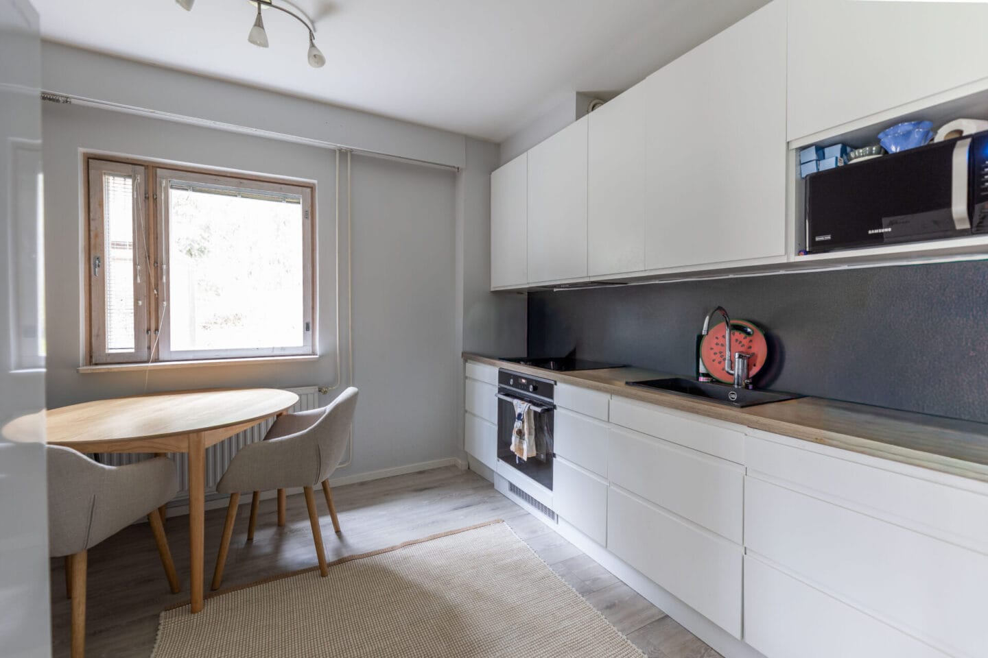 | Keittiön kuvaus | Liesi (Induktioliesi), työtasot (laminaatti), seinät (maali), lattiat (laminaatti), jääkaappipakastin, erillisuuni, liesituuletin ja astianpesukone |