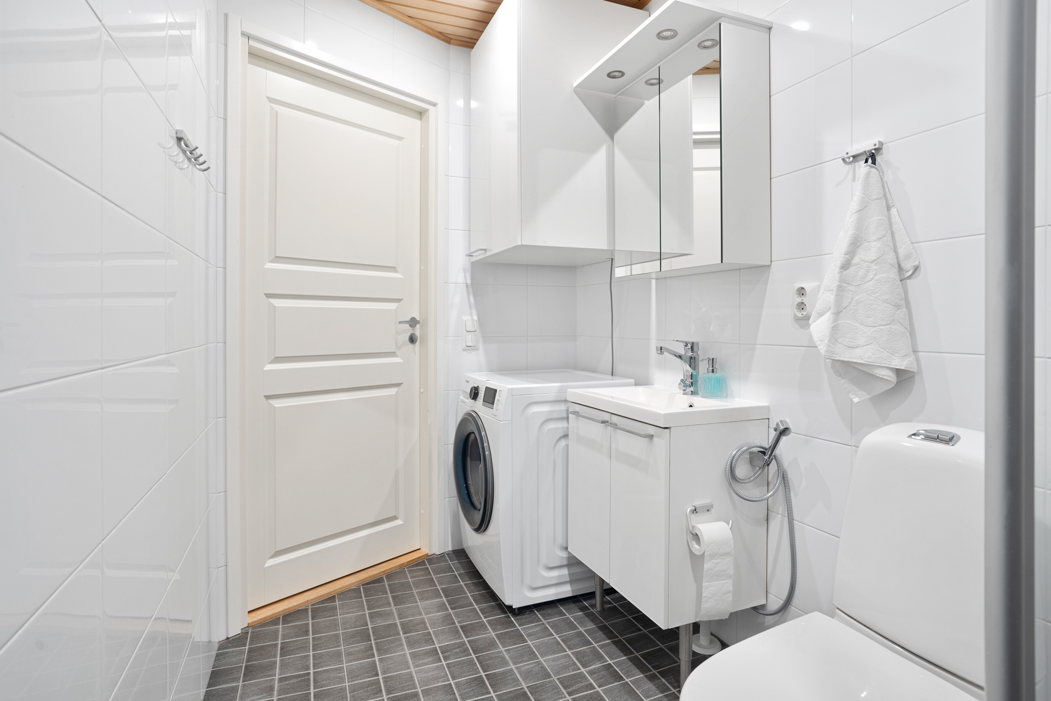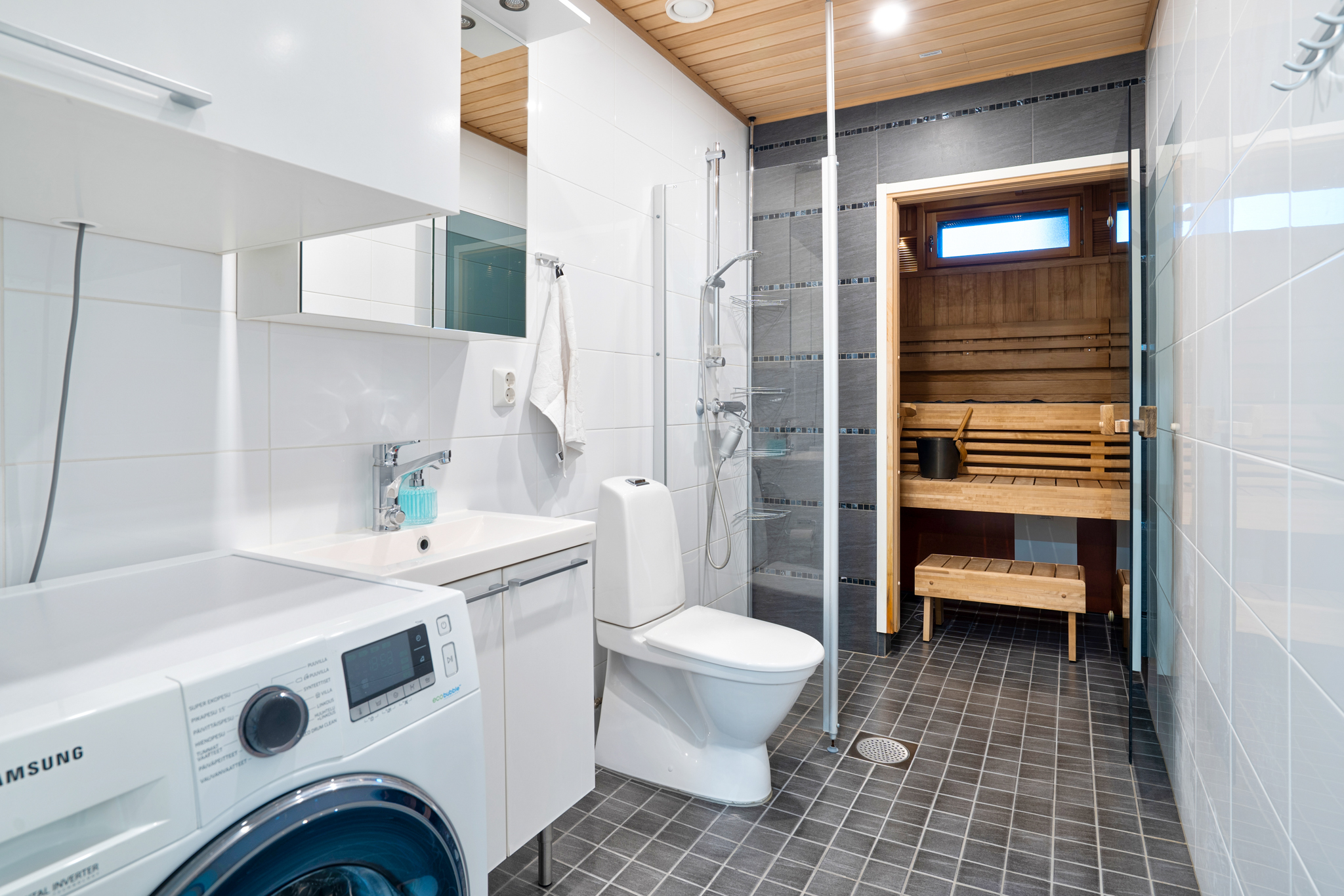 Palataanpa sisälle. Eteistilan yhteydestä pääset kaakelipinnoin varustettuun kylpyhuoneeseen sekä ikkunallinen sauna seuraavaa löylyttelijää ajatellen. Makuuhuoneeseen mahdutat leveän sängyn sekä tuulikaapin puolella lisäsäilytystilaa kodintekstiileille.