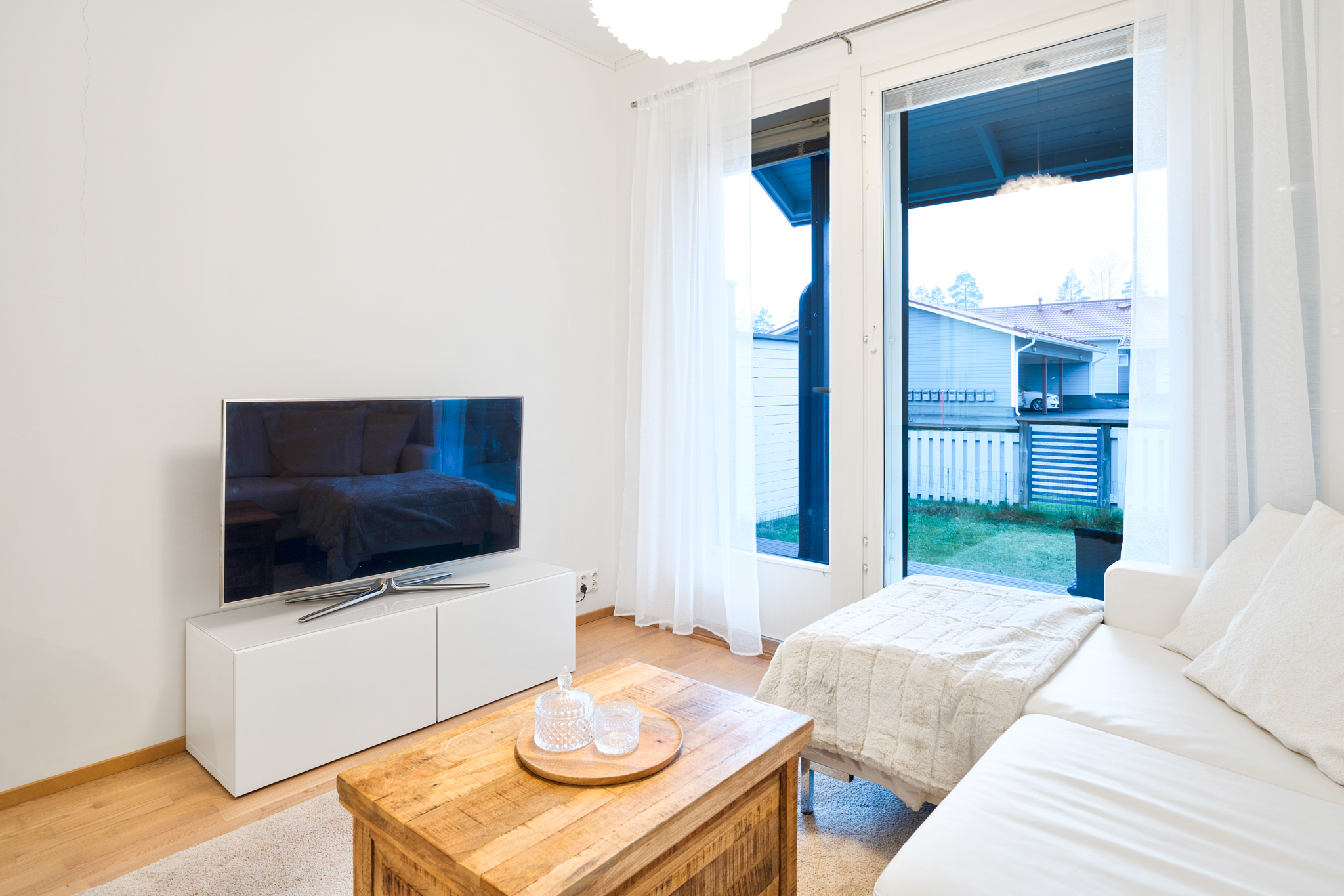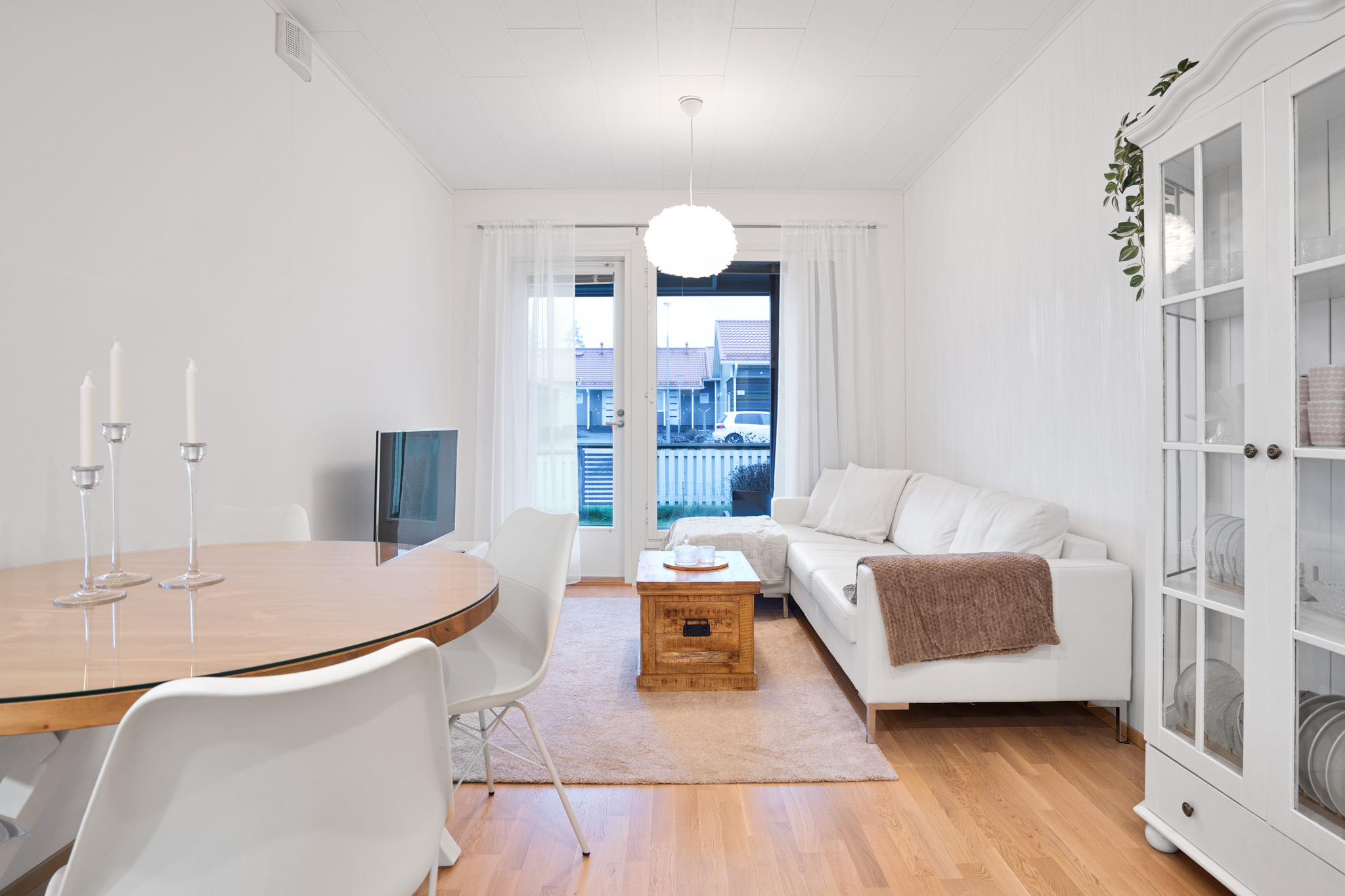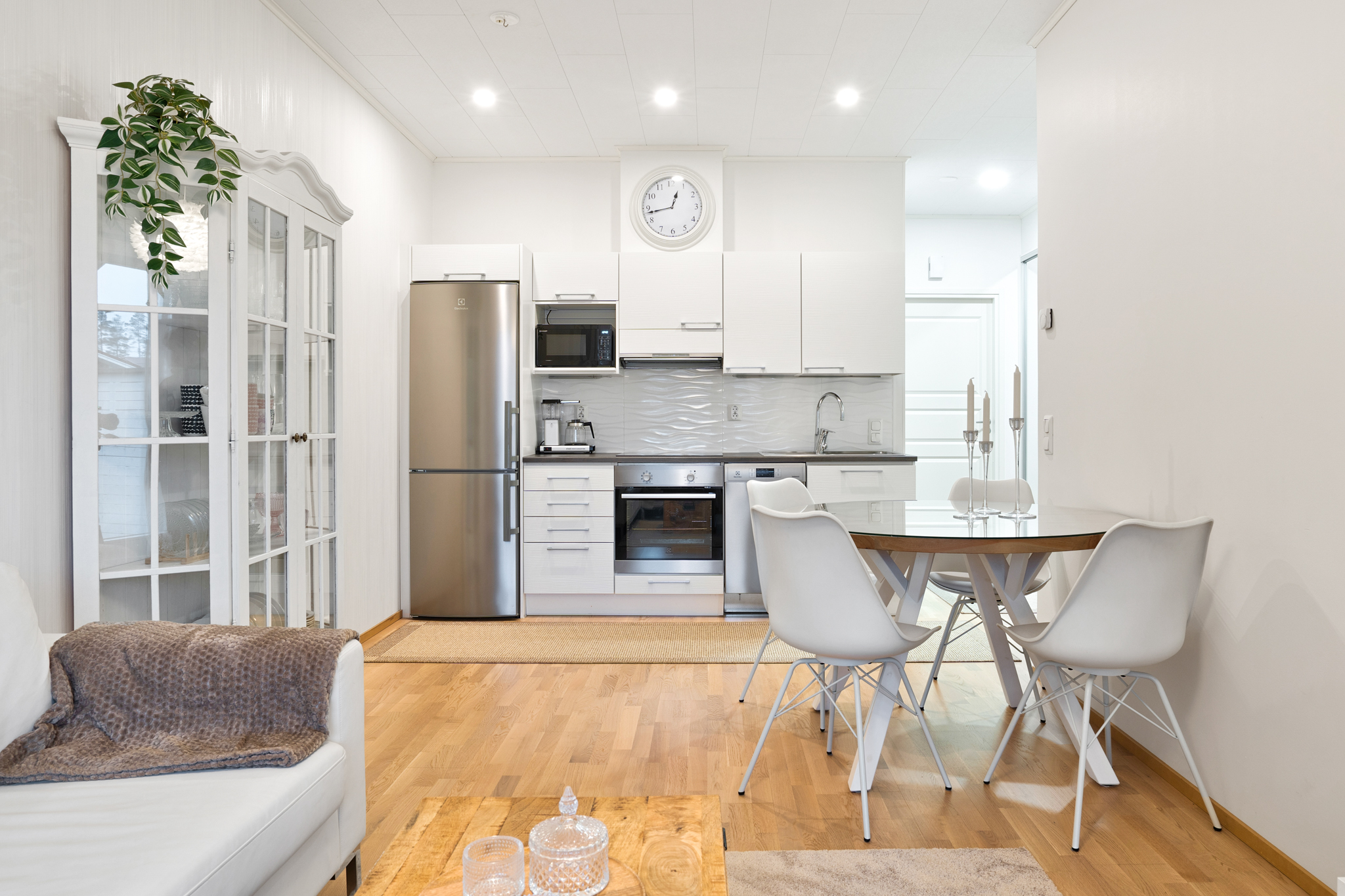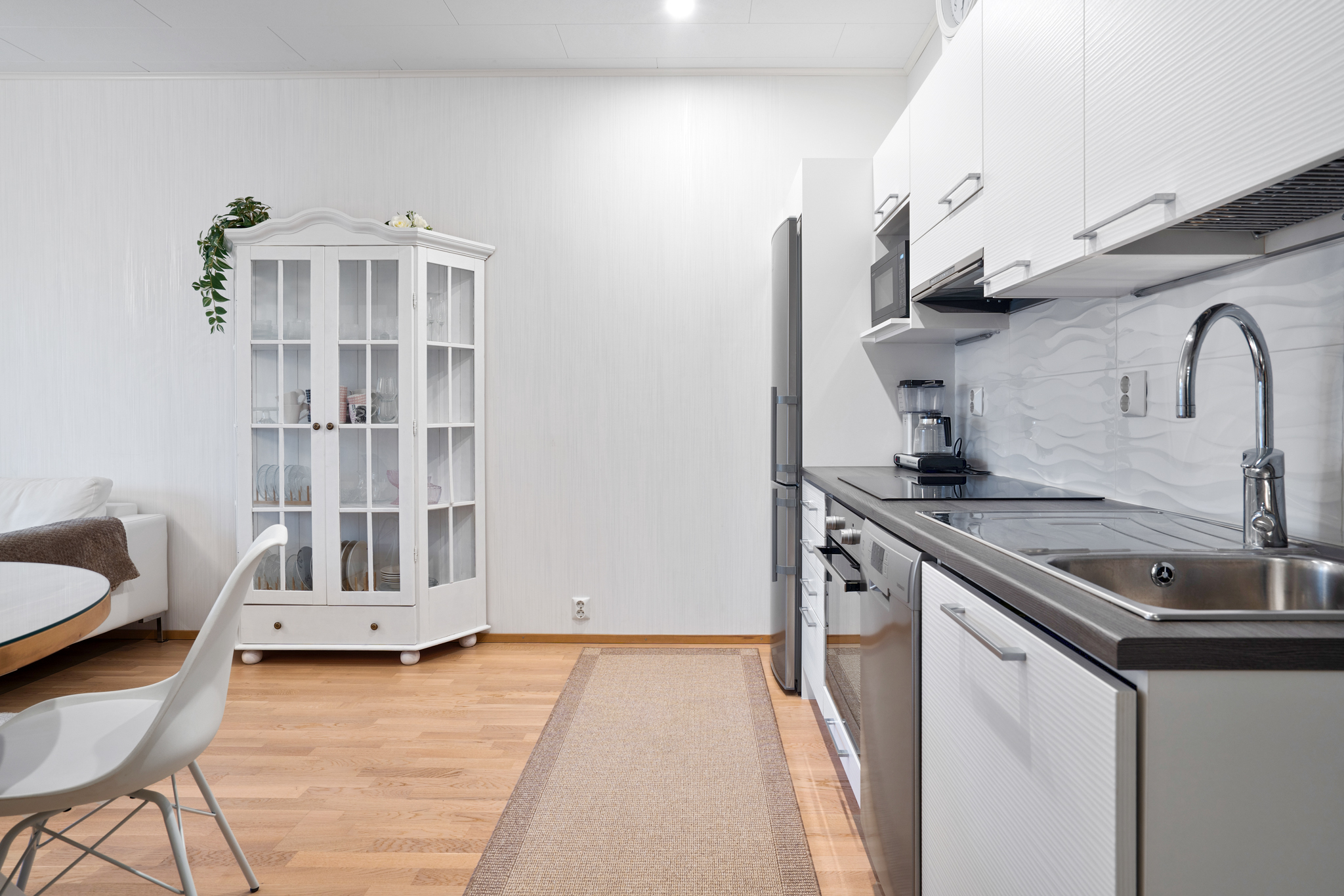 Karhunmäestä nyt tarjolla saunallinen kaksio nuorekkaalla ilmeellä toteutettuna. Lämmitysjärjestelmänä energiatehokas maalämpö, joka pitää asuinkustannukset maltillisina. Tämä muuttovalmis koti odottaakin seuraavia asukkaita jo saapuvaksi. Eteistilan yhteydessä reilusti kaappitilaa peilillisten liukuovikaapistojen takana. Olohuoneen yhteydessä keittiö rosterisine kodinkoneineen. Tämän tilan yhteydestä käynti takapihalle, joka käsittää katetun terassin ja pienen nurmialueen.