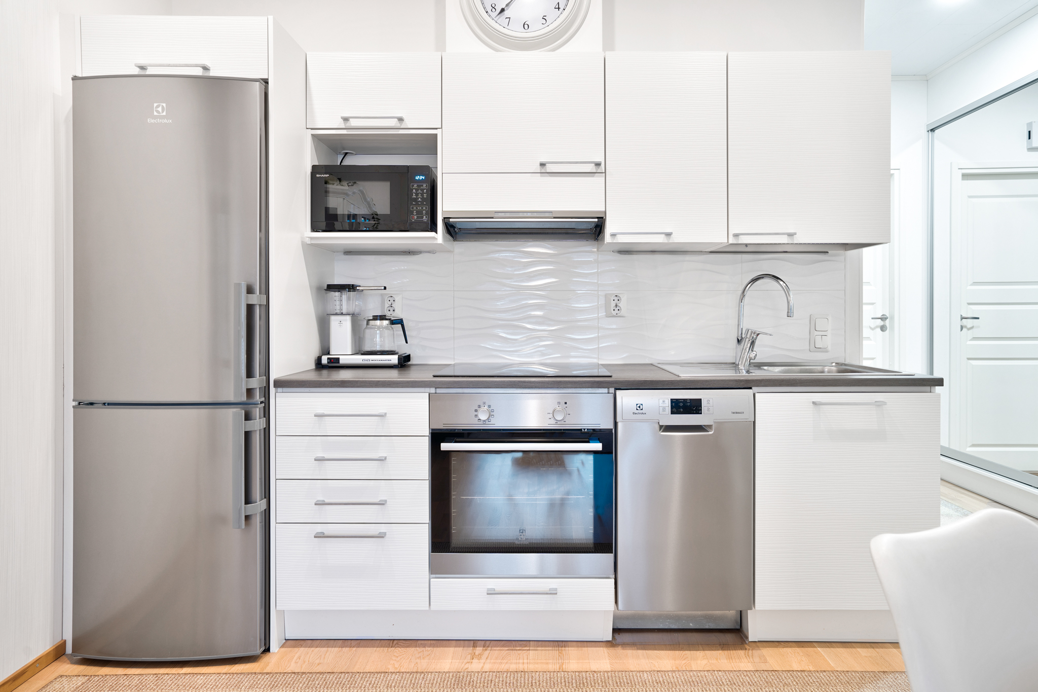 | Keittiön kuvaus | Liesi (Induktioliesi), työtasot (laminaatti), seinät (maali ja tapetti), lattiat (parketti), jääkaappipakastin, erillisuuni, liesi, astianpesukone ja liesituuletin |