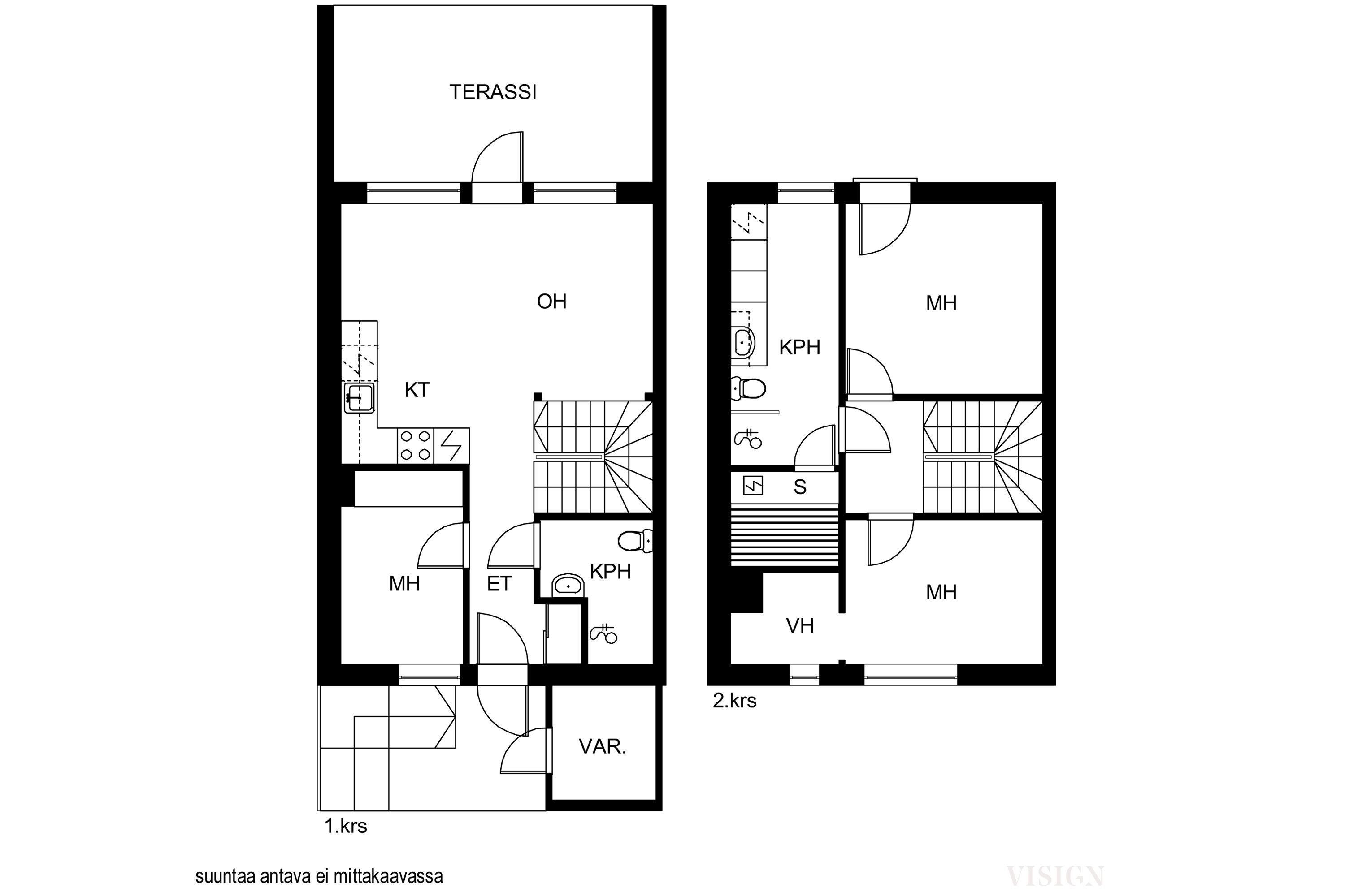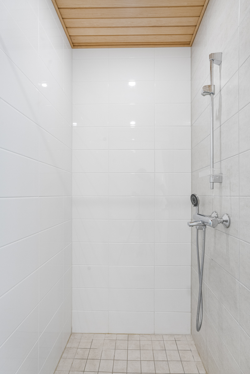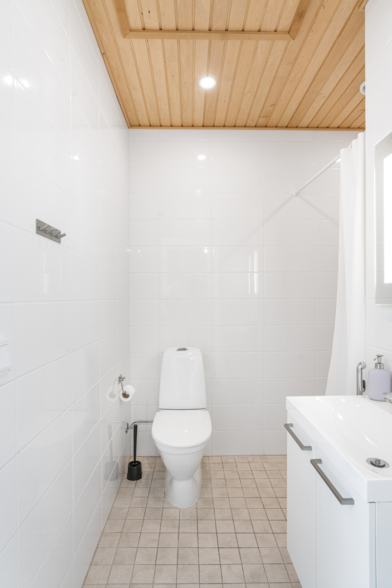 WC-istuin (2kpl, ylä-ja alakerrassa), suihku ( ylhäällä 1kpl sadesuihku ja 1kpl normaali, alhaalla 1kpl normaali) ja peili, seinät (kaakeli), lattiat (laatta) |