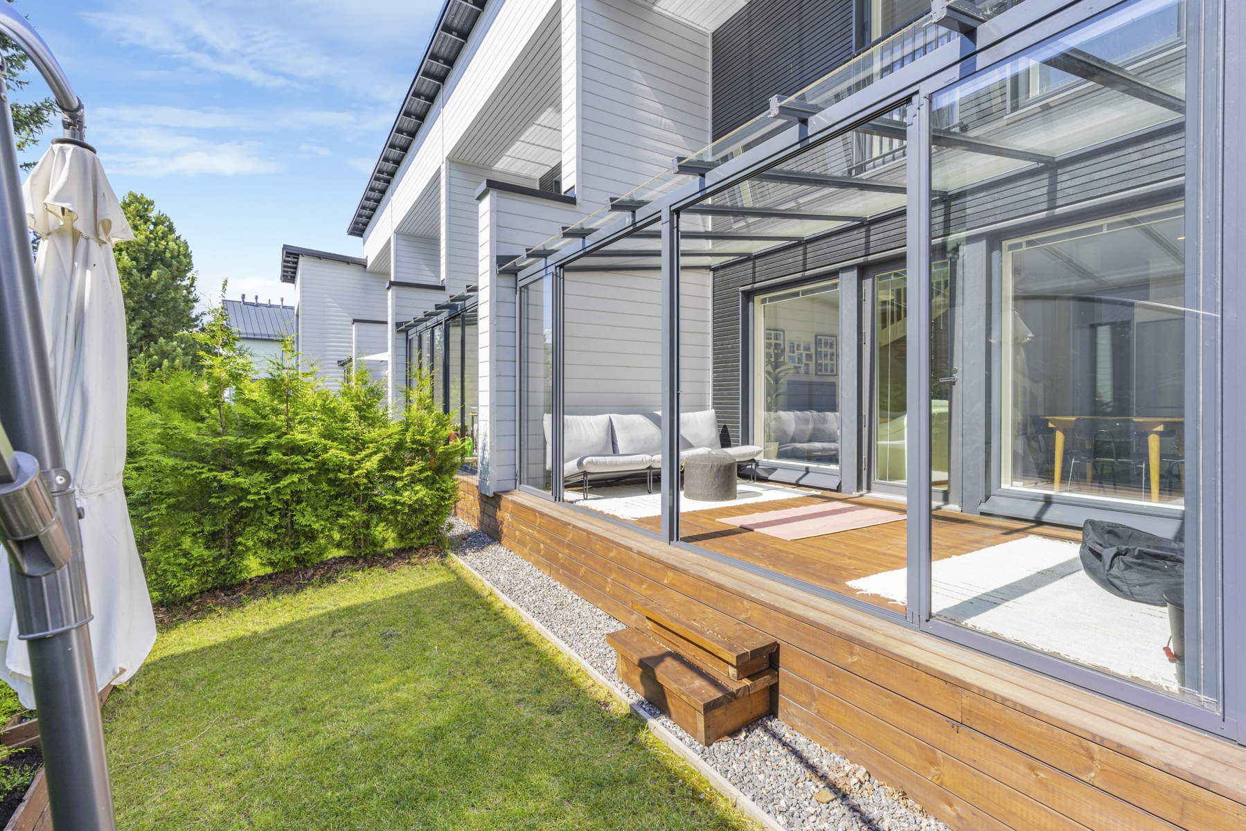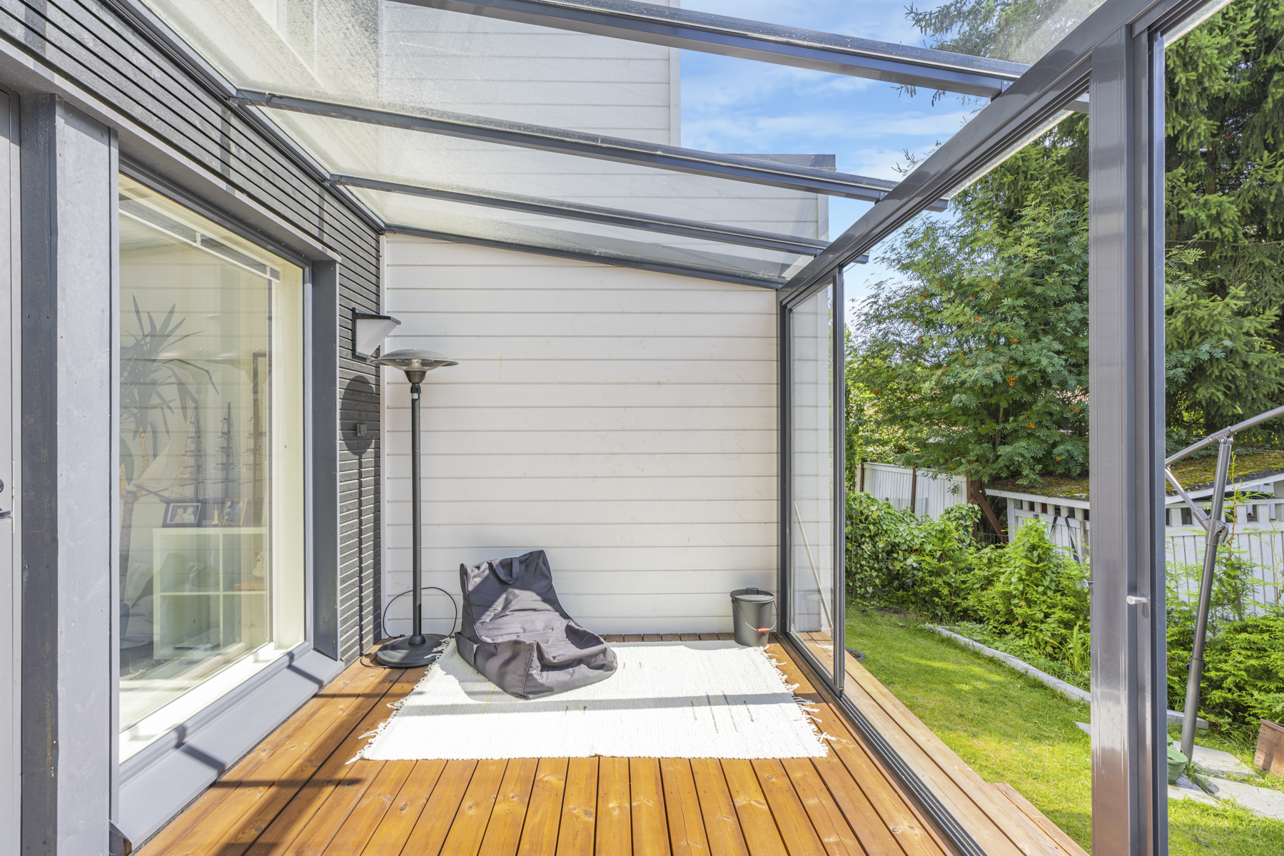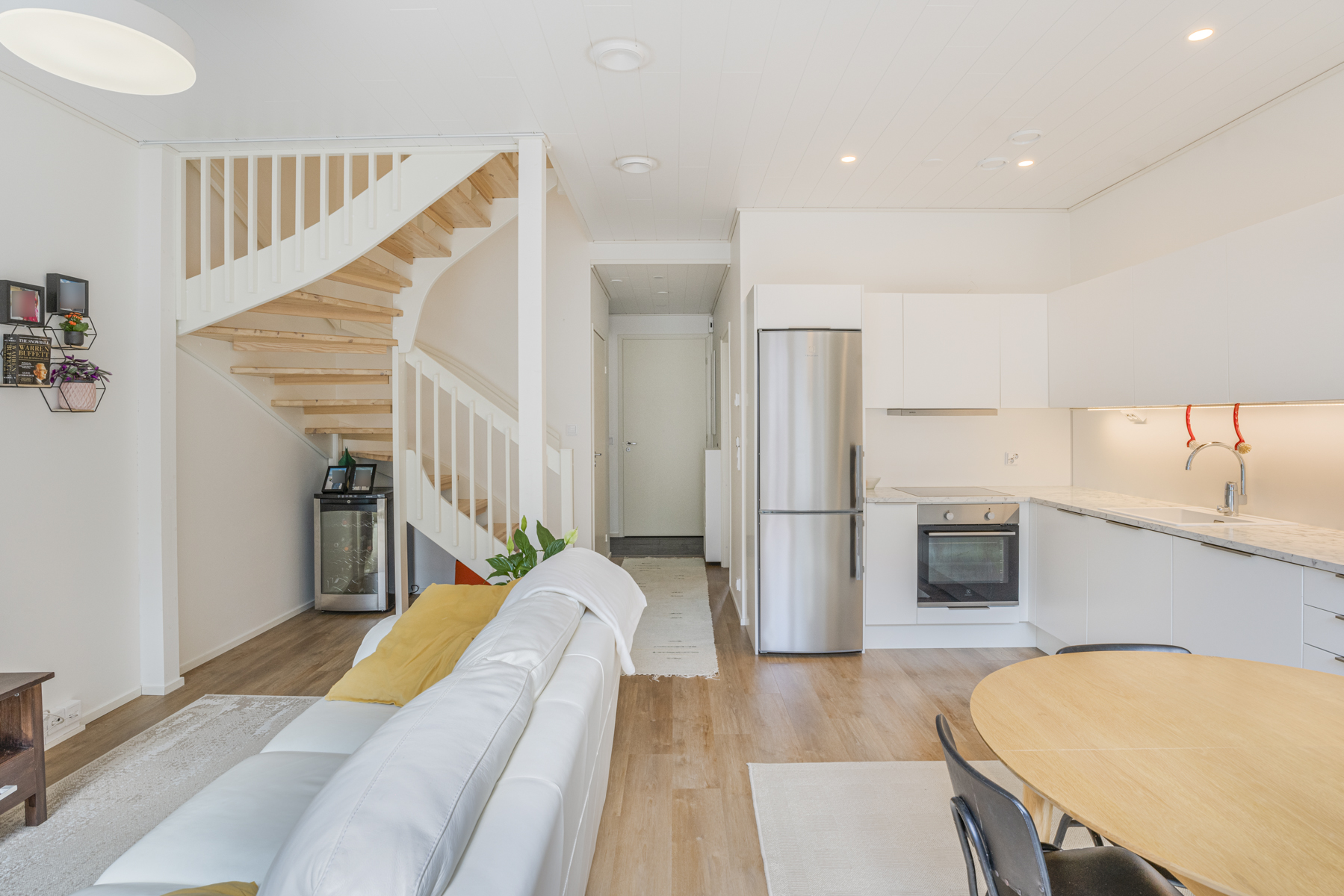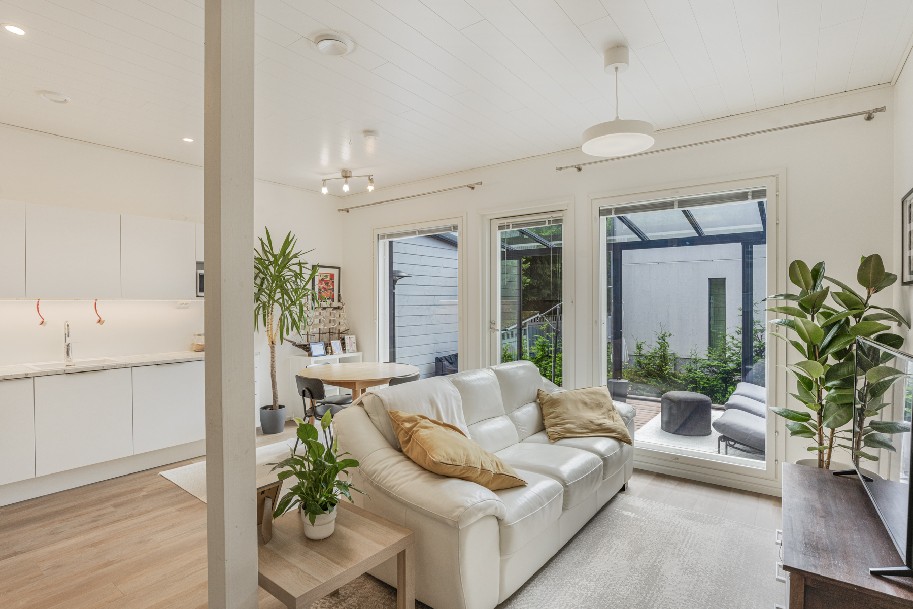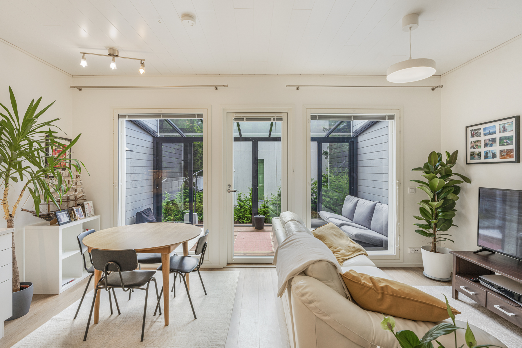 Avoin olohuone-keittiö muodostaa valoisan ja yhtenäisen oleskelutilan, johon suuret ikkunat tuovat runsaasti luonnonvaloa. Oleskelutilasta avautuu kulku kauniille lasitetulle terassille, joka jatkaa viihtyisää oleskelutilaa. Suojaisa piha-alue ilman häiritseviä “ikkunanaapureita” keskeisestä sijainnistaan huolimatta!