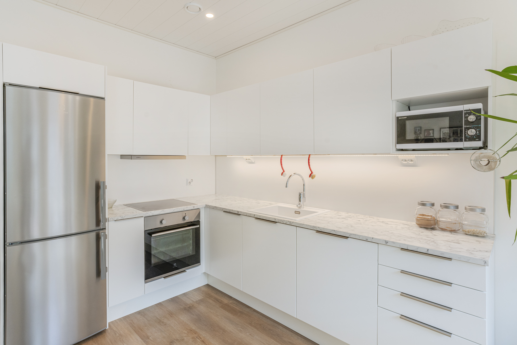 Liesi (Induktioliesi), työtasot (laminaatti), seinät (maali), lattiat (vinyyli), jääkaappipakastin, liesituuletin ja astianpesukone |