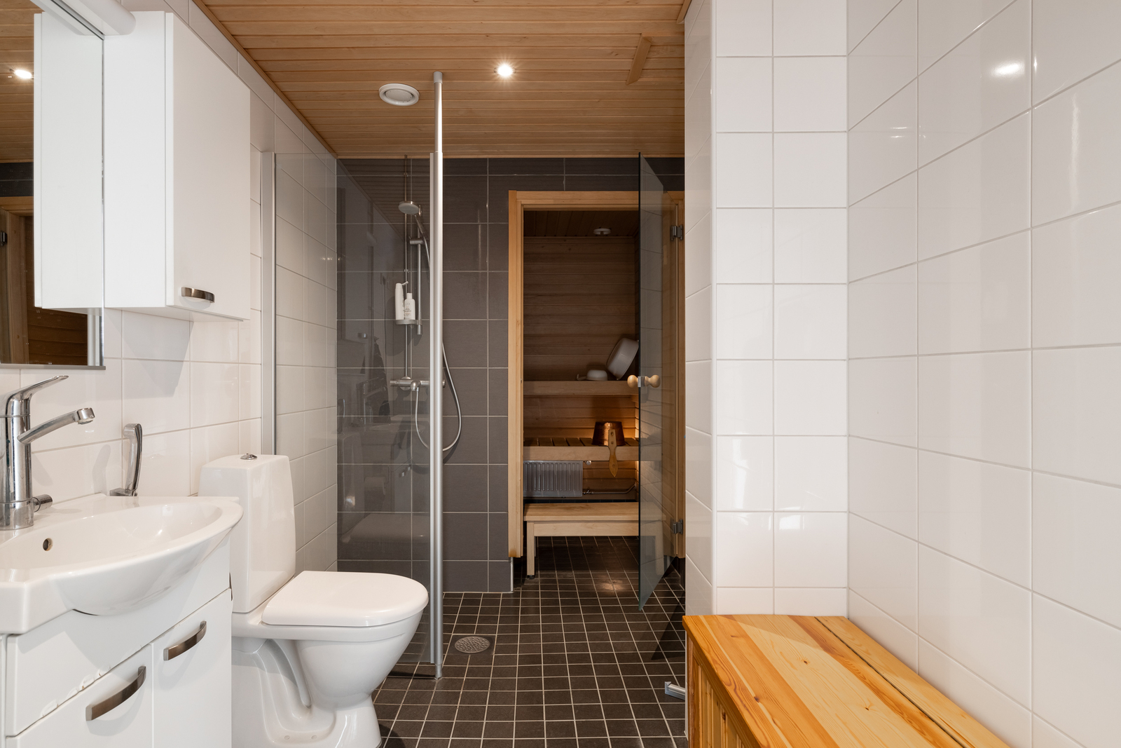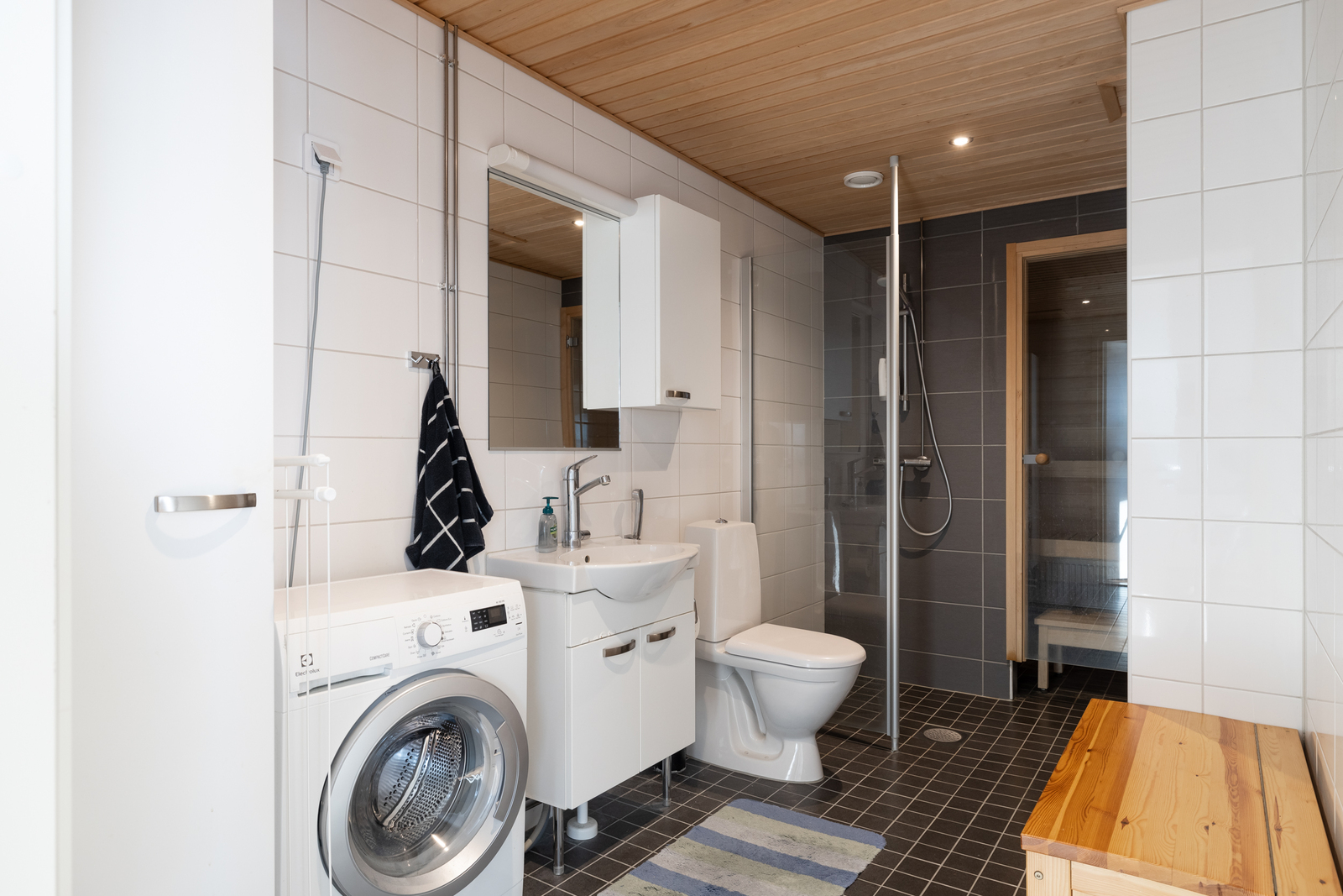 Suihku, wc-istuin, peili, lattialämmitys, pesukoneliitäntä, suihkuseinä, allaskaappi ja kiinteät valaisimet, seinät (kaakeli), lattiat (laatta) |