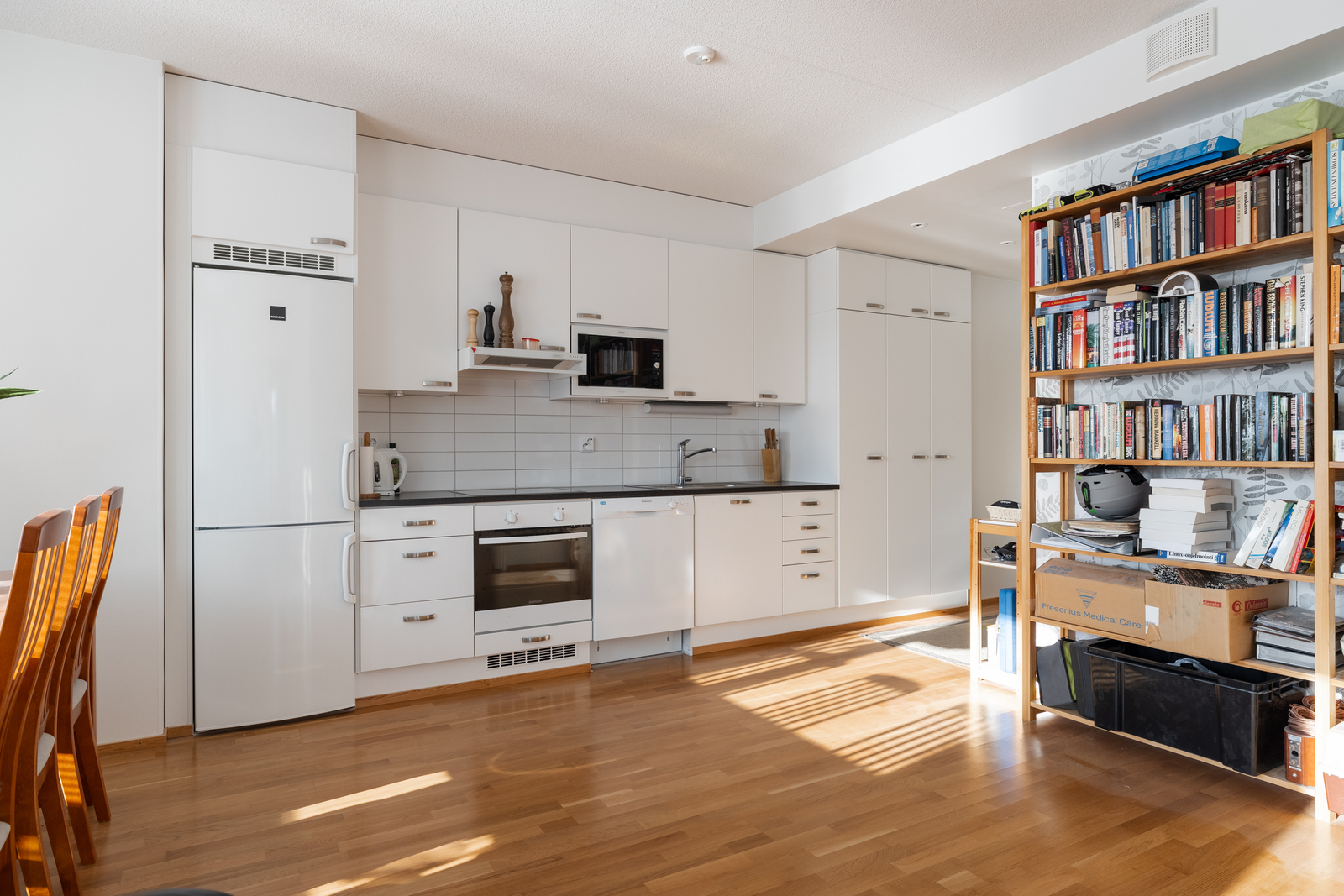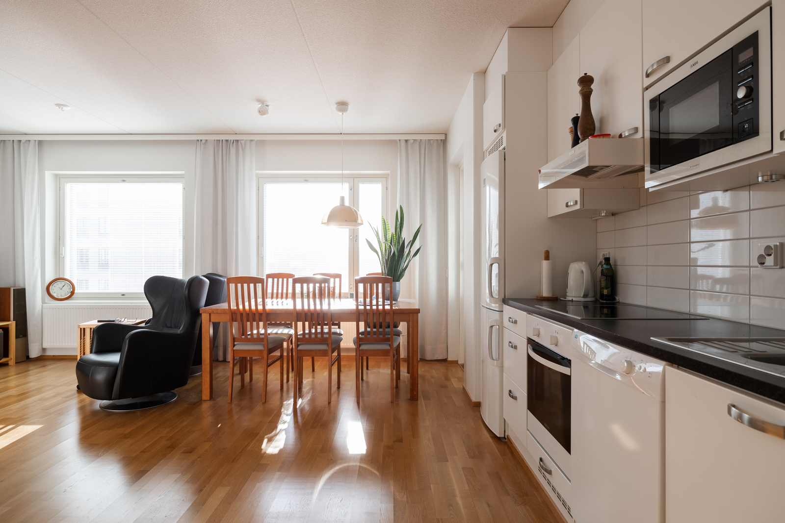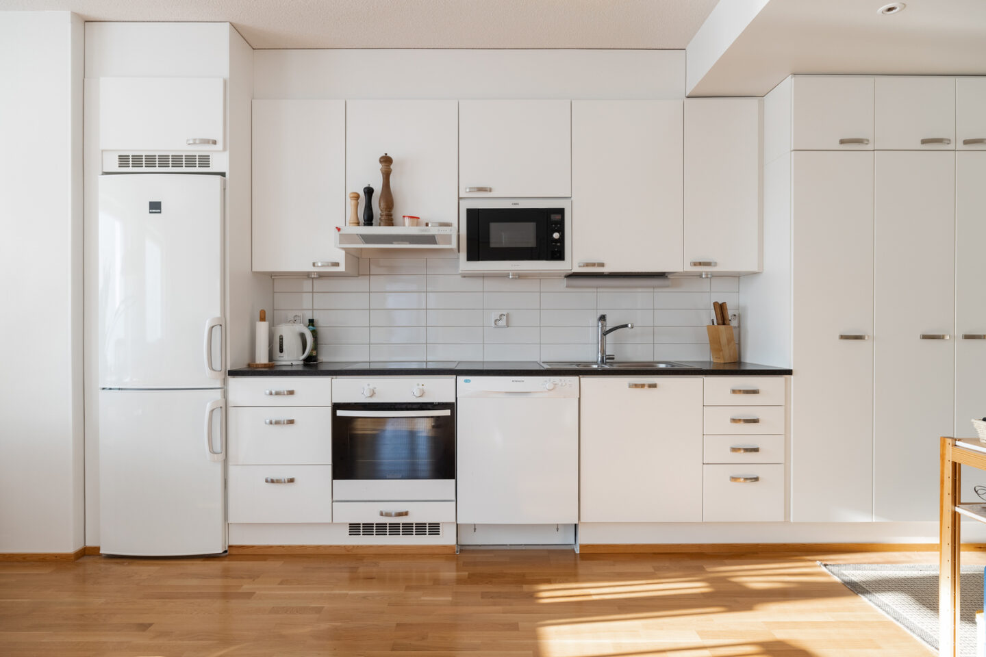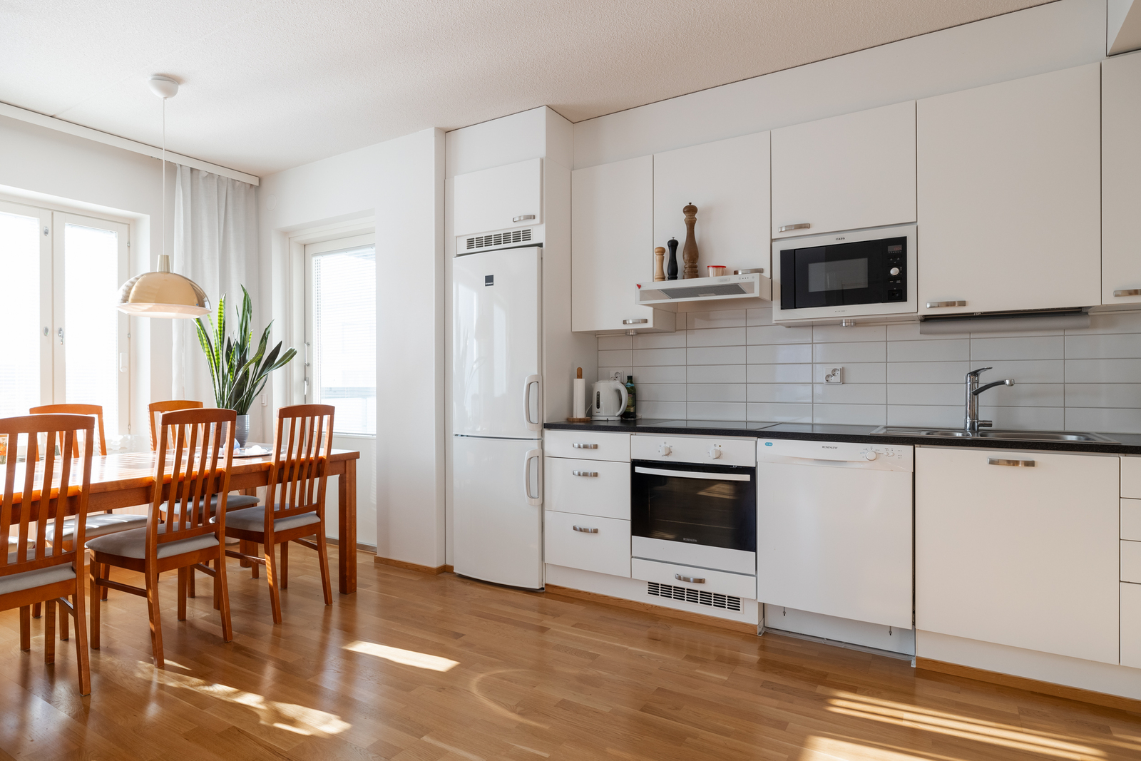 Liesi (Keraaminen liesi ja erillisuuni), työtasot (laminaatti), seinät (maali ja osalaatoitus), lattiat (parketti), erillisuuni, mikroaaltouuni, jääkaappipakastin, astianpesukone ja kiinteät valaisimet, liesituuletin / hormi |