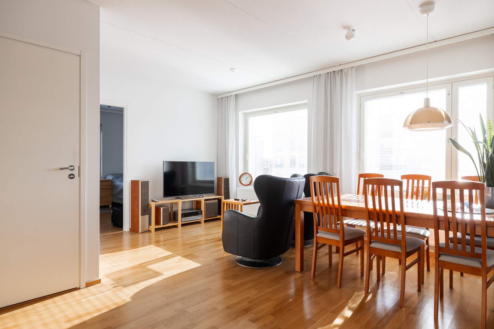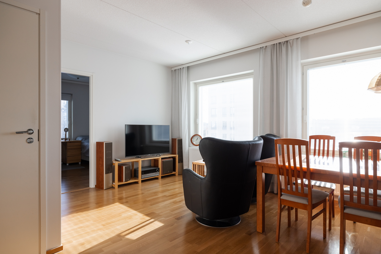 Kaukajärven suositulla asuinalueella on myynnissä viihtyisä kuudennen kerroksen saunallinen kaksio, joka tarjoaa 51,5 neliömetriä hyvin suunniteltua ja tilavaa asumisratkaisua. Tämä koti tuntuu neliöitään suuremmalta, sillä keittiö ja olohuone muodostavat avaran ja yhtenäisen tilan, joka on helppo sisustaa niin ruokailu- kuin oleskelutilaksi. Makuuhuoneessa on hyvin tilaa niin sängylle kuin työskentelypisteellekin.