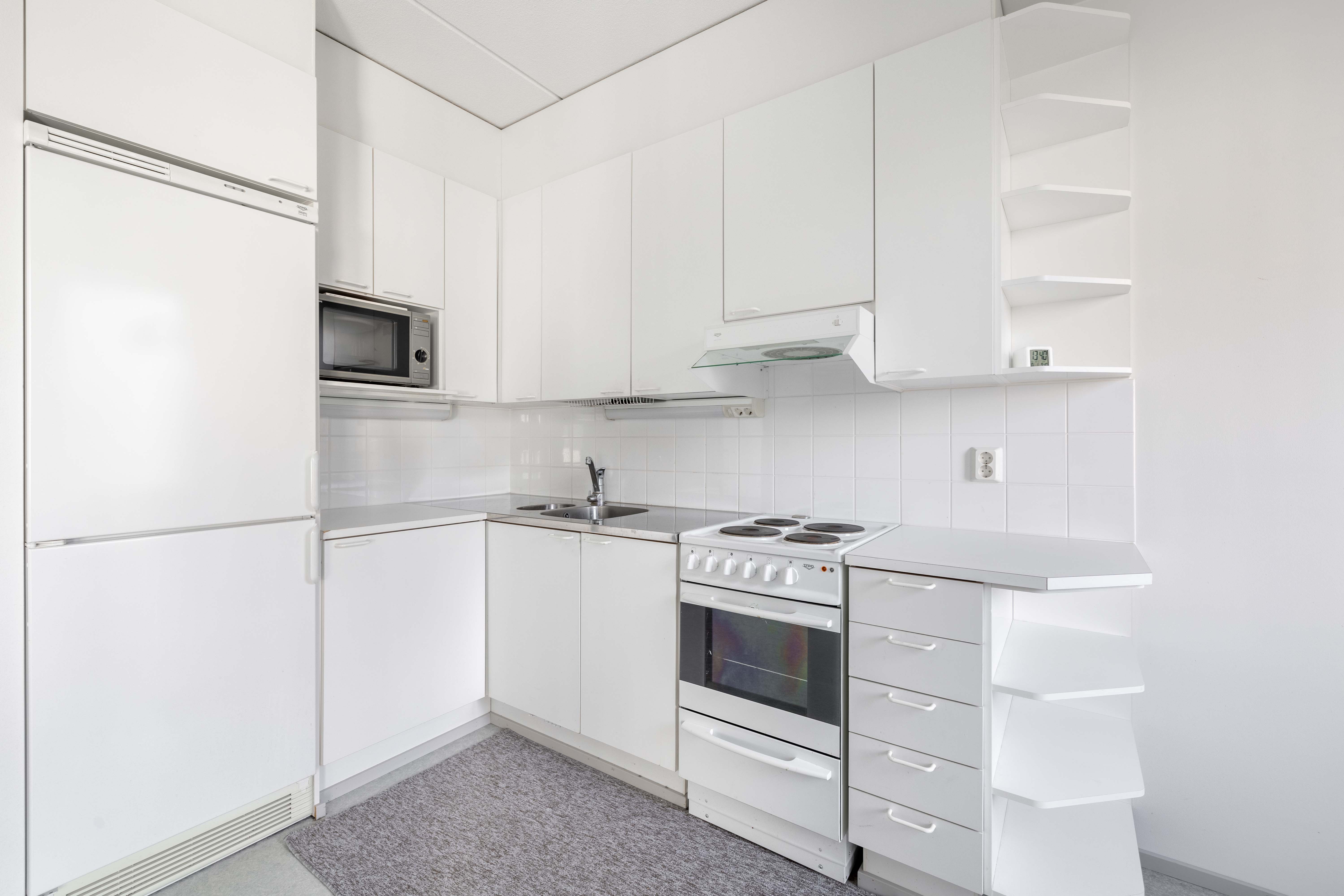 | Keittiön kuvaus | Liesi (Sähköhella), työtasot (laminaatti ja metalli), seinät (maali), lattiat (muovimatto), jääkaappipakastin, liesituuletin ja mikroaaltouuni, keittiön kaapit: valkoinen keittiön välitila: valkoinen katto: maalattu valkoinen |