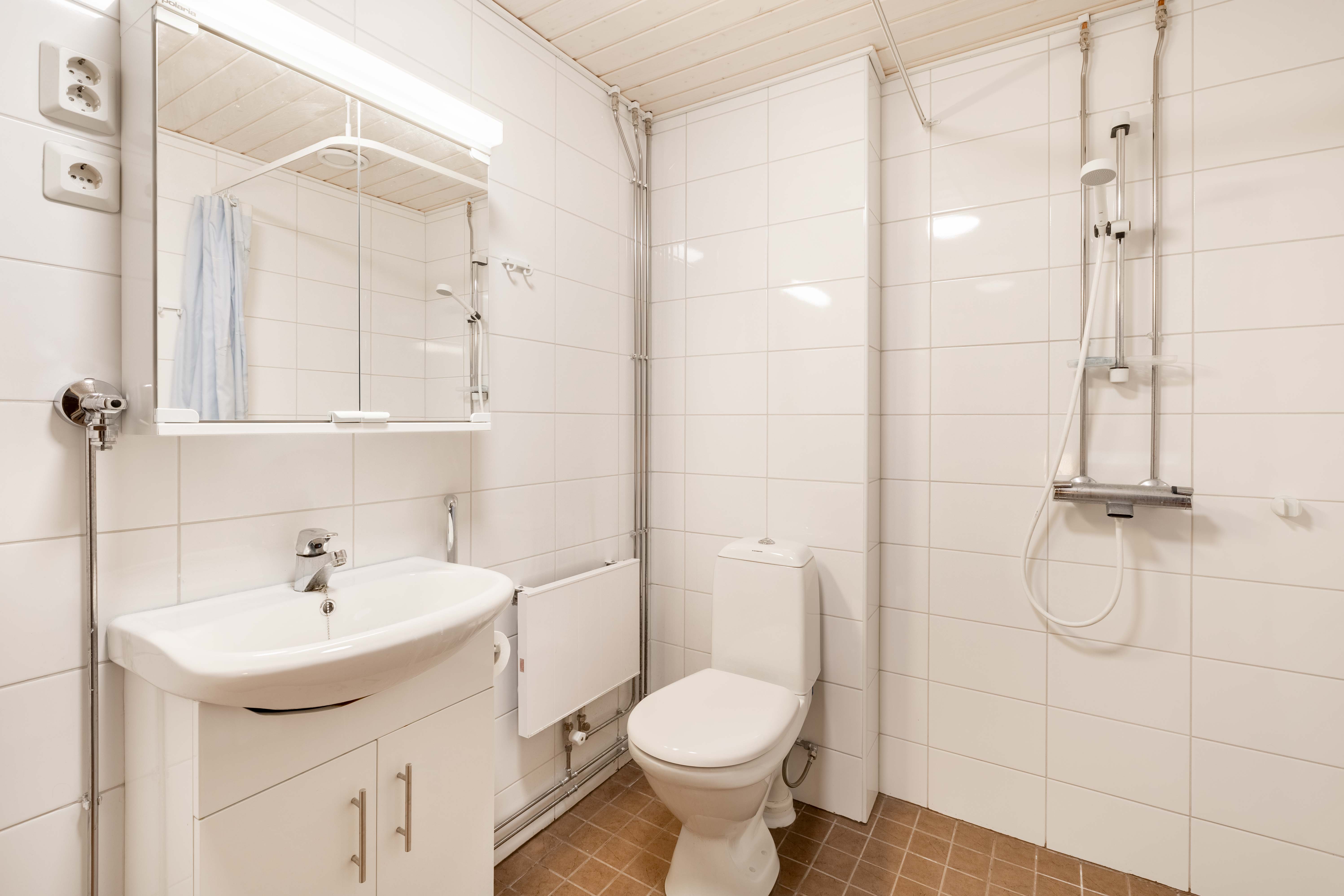 | Kylpyhuoneen kuvaus | WC-istuin, suihku ja peilikaappi, seinät (kaakeli), lattiat (laatta), seinälaatta: valkoinen lattialaatta: ruskea katto: maalattu valkokuulto paneeli |