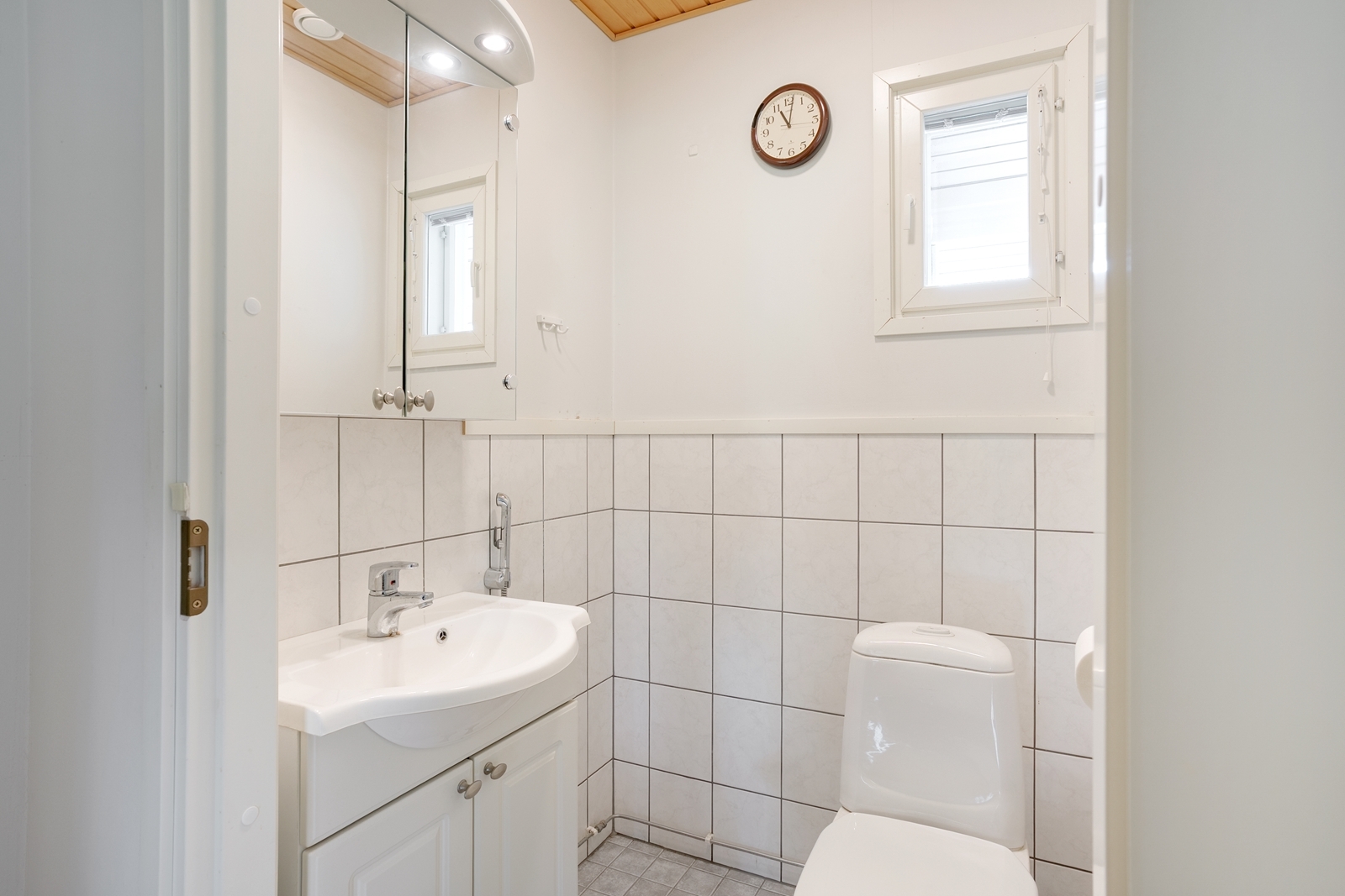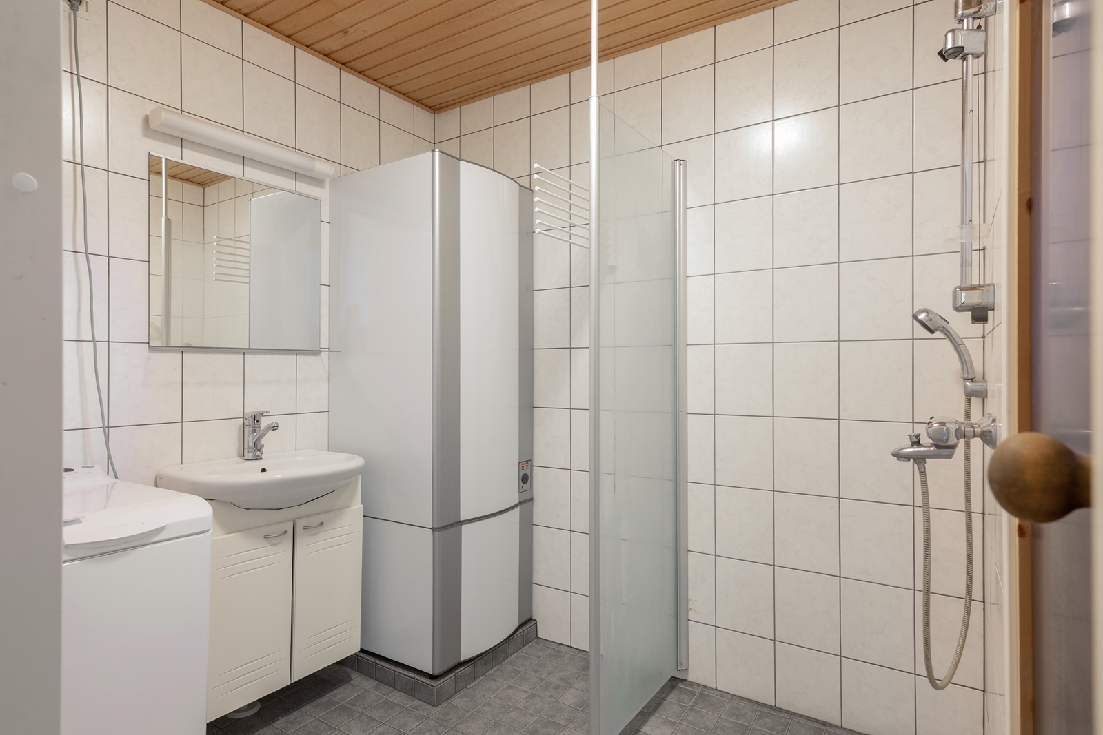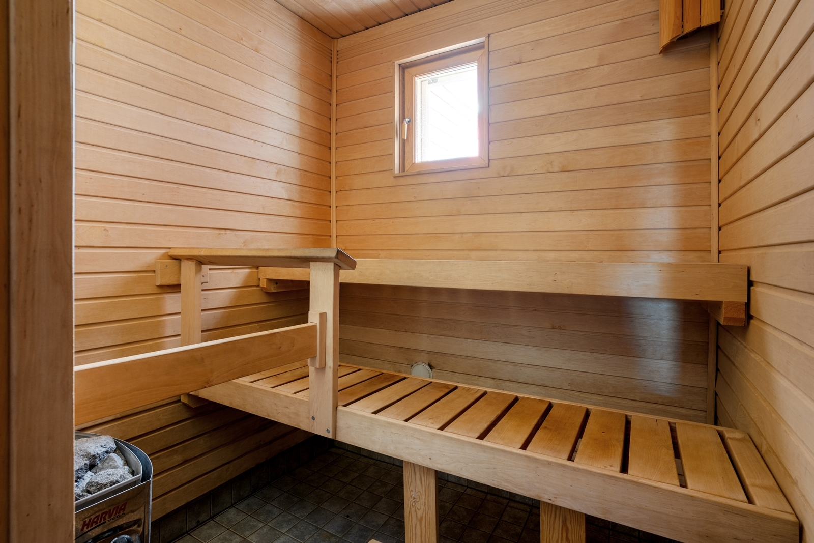 Seinät (puu), lattiat (laatta), Sähkökiuas, katto paneloitu |
