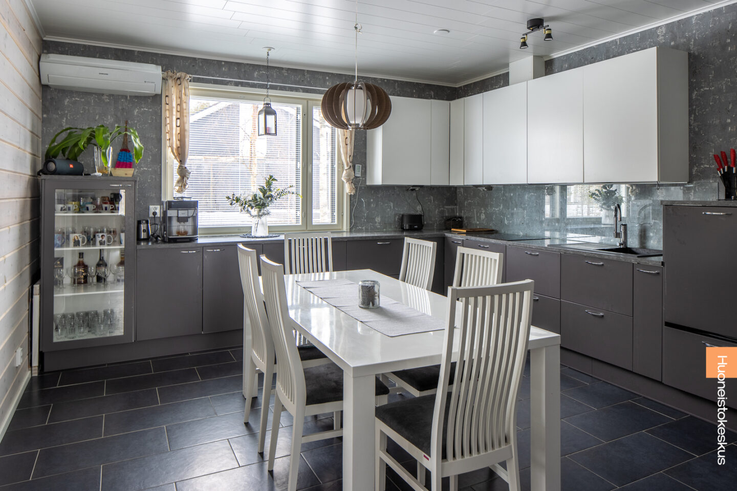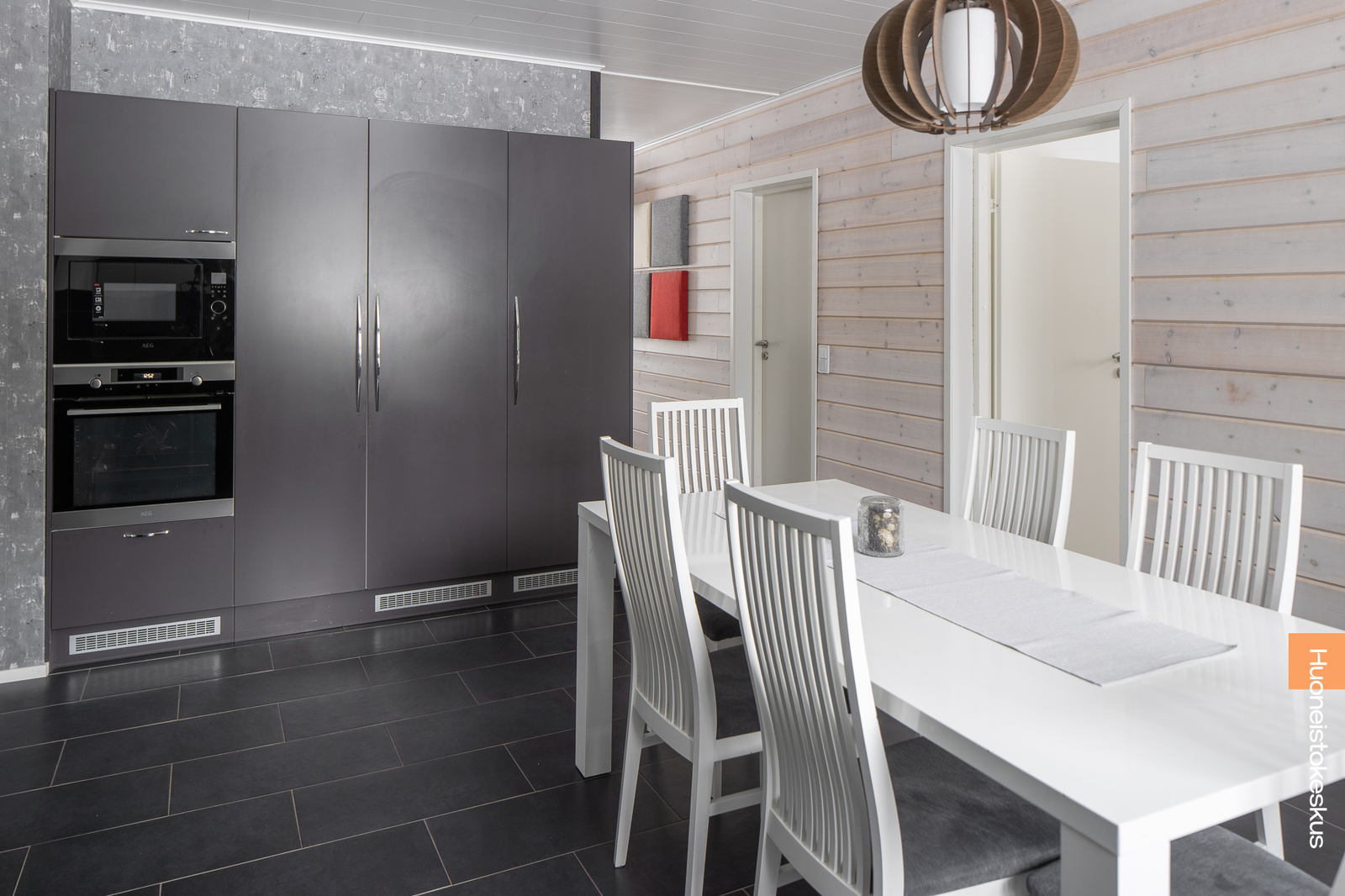 | Keittiön kuvaus | Liesi (Induktioliesi ja erillisuuni), työtasot (laminaatti), seinät (tapetti ja puu), lattiat (laatta), liesi, jääkaappi, erillisuuni, mikroaaltouuni, erillinen pakastin ja liesituuletin / hormi, kiinteät valaisimet |