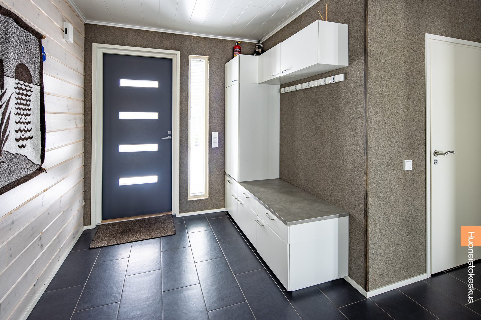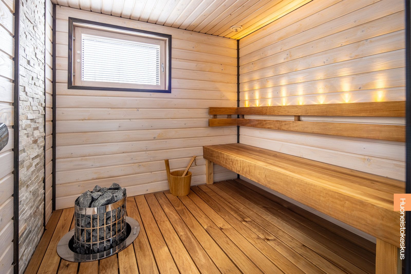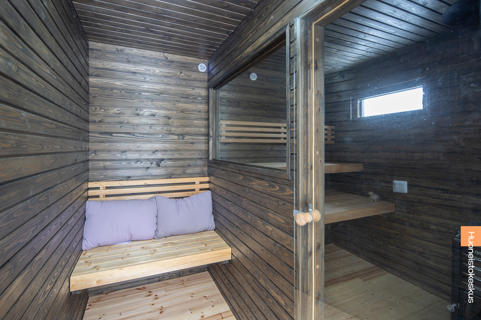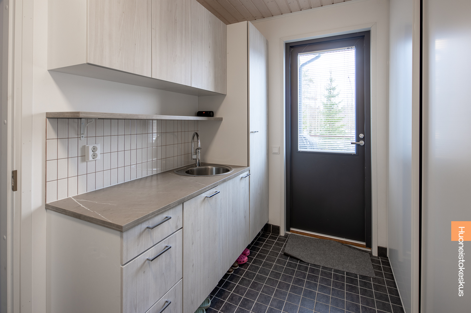Kodinhoitohuoneesta suora kulku takaterassin kautta ulkosaunalle, lisäksi sisällä siistit pesuhuone ja saunatilat. Säilytystilaa on kaapistojen lisäksi talon yhteydessä olevassa varastossa.