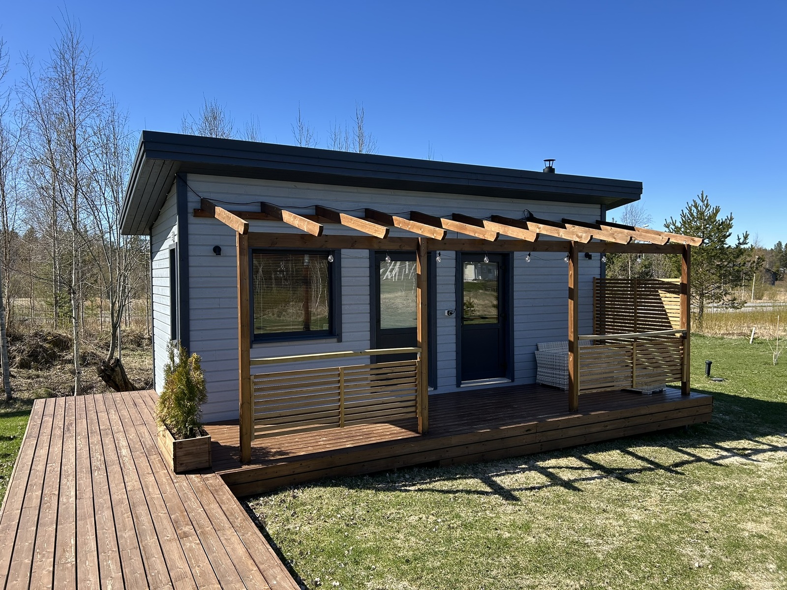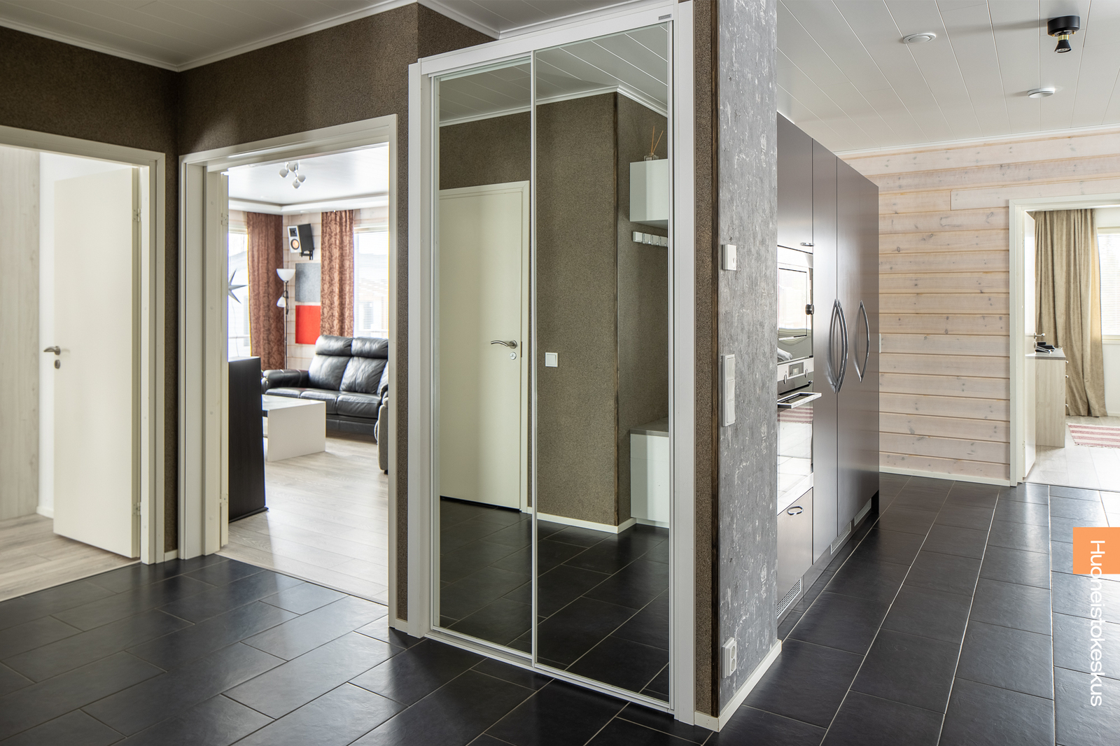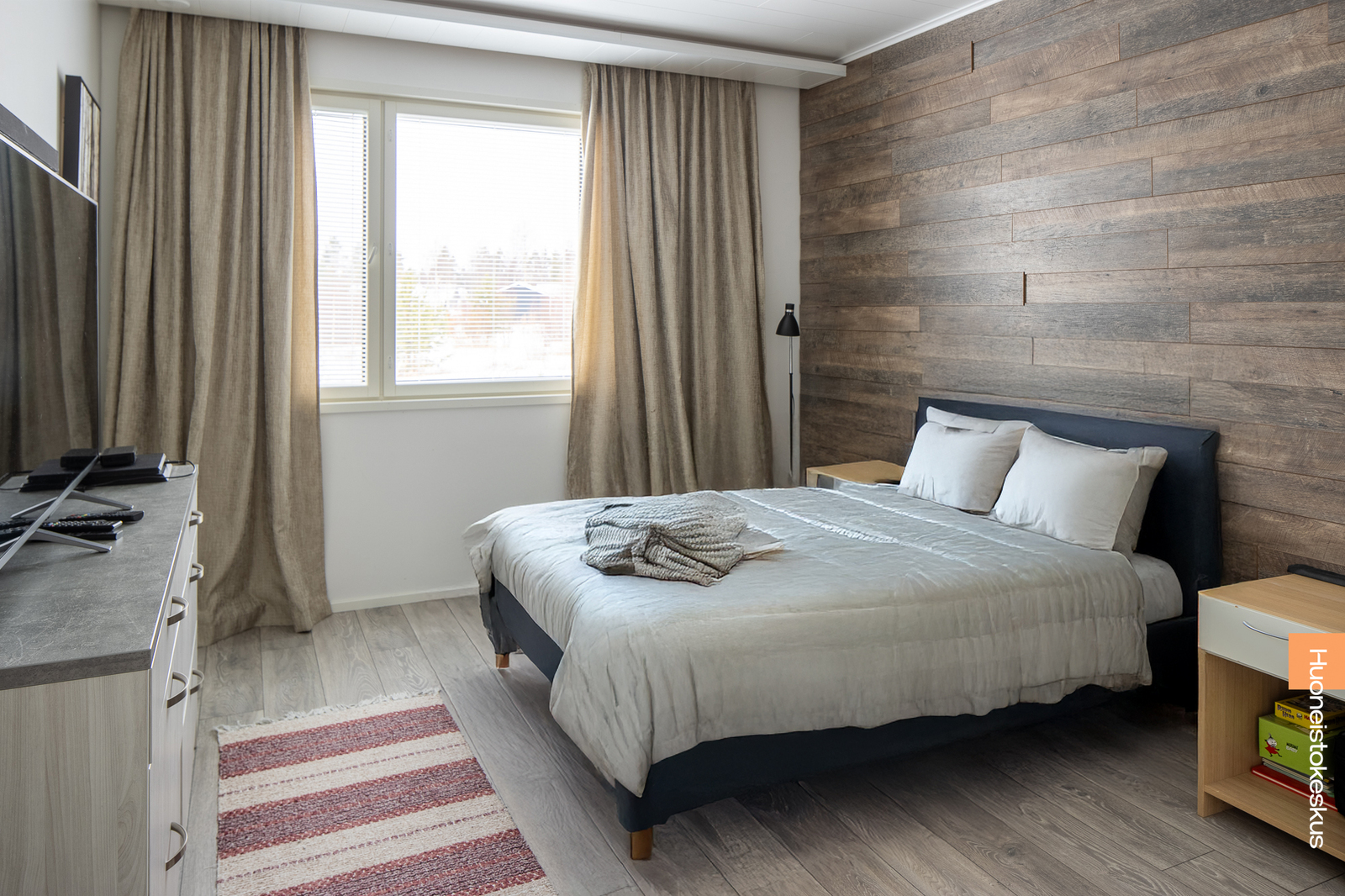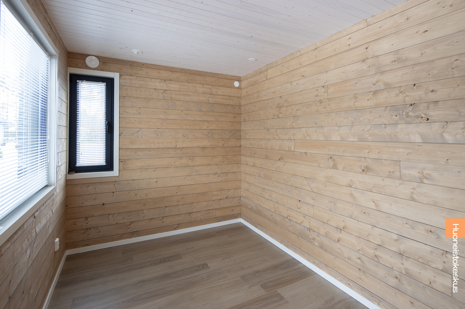 | Seinämateriaalien kuvaus | Saunassa puupaneeli, pesuhuone kaakeli, päämakuuhuoneessa sisustuspaneeli tehosteseinä, oleskelutiloissa puupaneelia, muut seinät tapetti/maalipinnalla. |