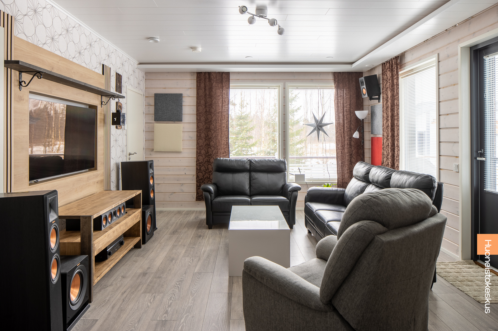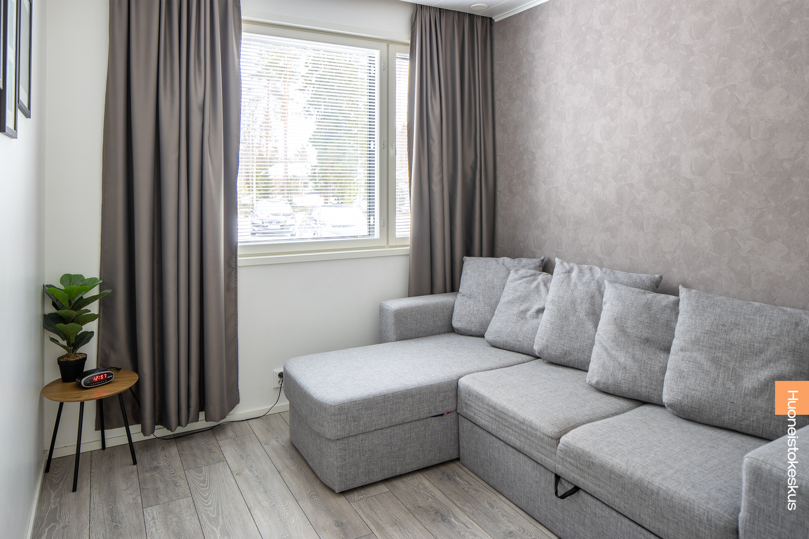 | Olohuoneen kuvaus | Seinät (tapetti ja puu), lattiat (laminaatti) |