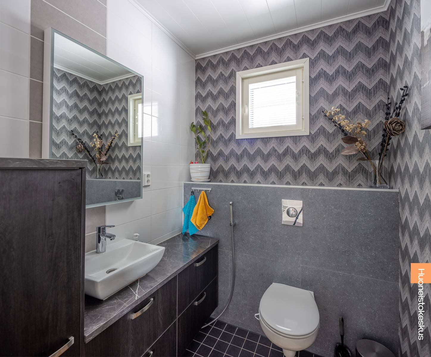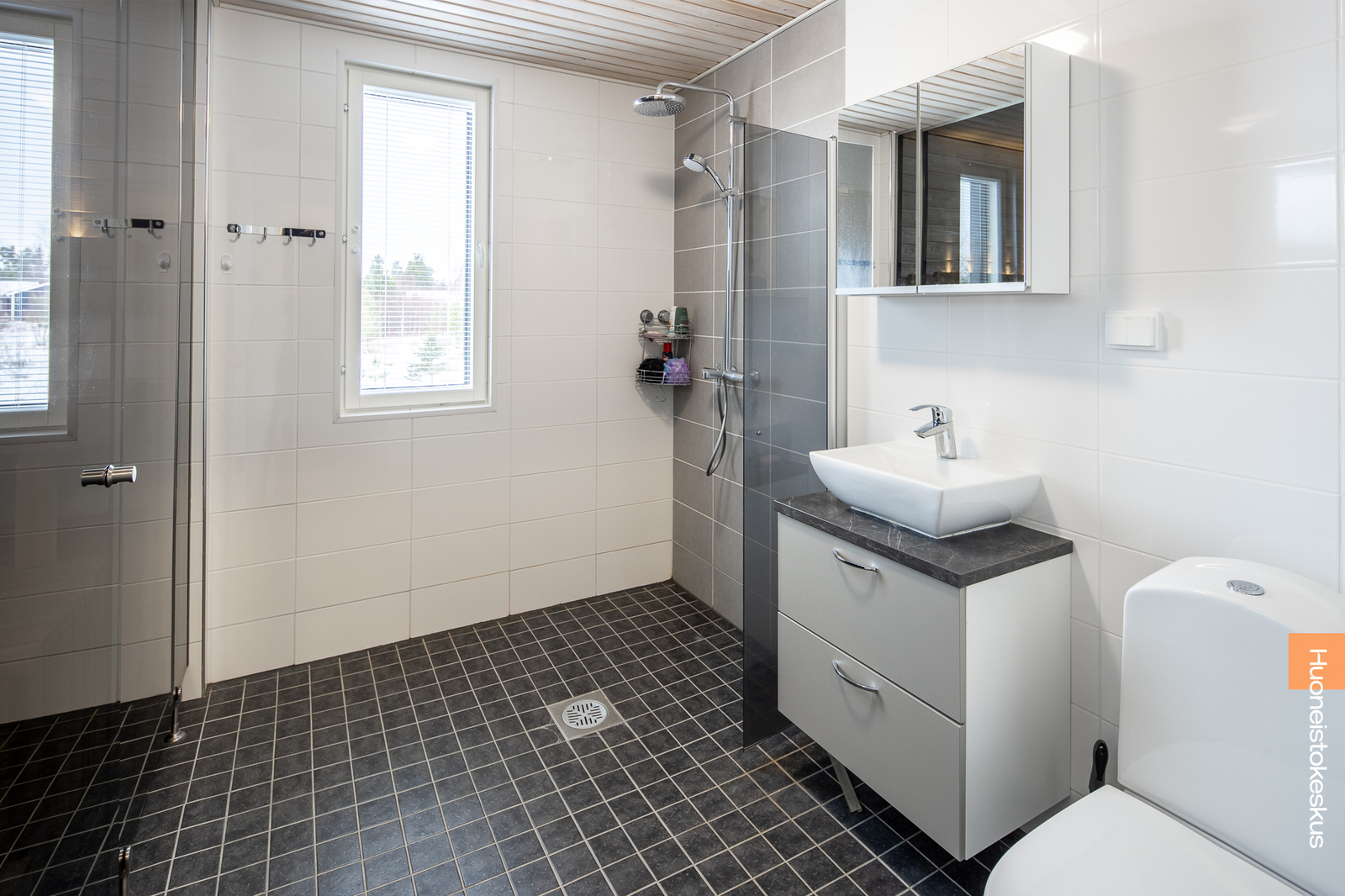 | Kylpyhuoneen kuvaus | Suihkuseinä, wc-istuin, lattialämmitys, peilikaappi, suihku ja kiinteät valaisimet, seinät (kaakeli), lattiat (laatta) |