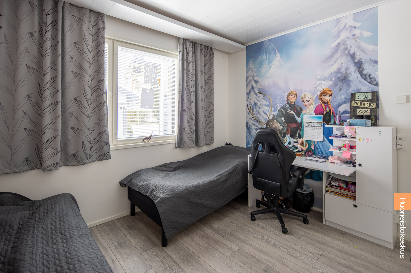 | Makuuhuoneen kuvaus | Lukumäärä: 3, seinät (tapetti ja maali), lattiat (laminaatti) |