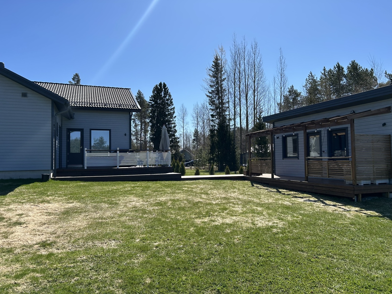 Terassialue kiertää etukuistilta aina takapihalle ja ulkosaunalle saakka.