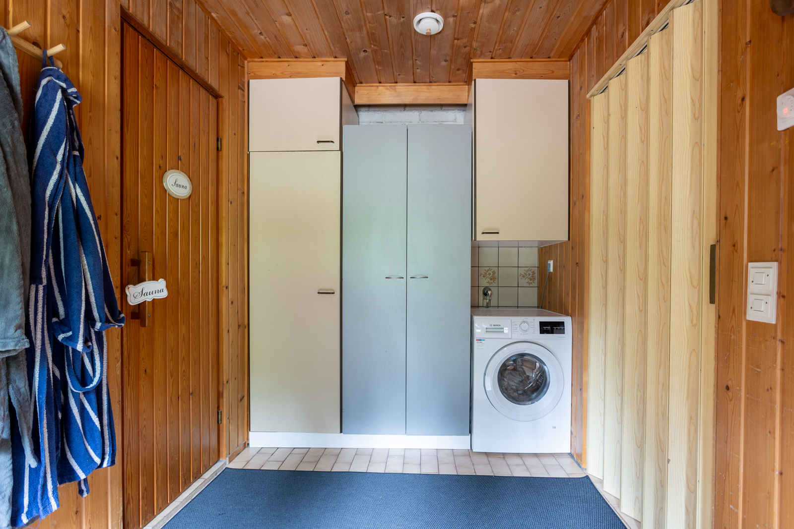 | Kodinhoitohuoneen kuvaus | Lattialämmitys ja pesukoneliitäntä, lattiat (laatta), Seinät ja katto paneloitu. |