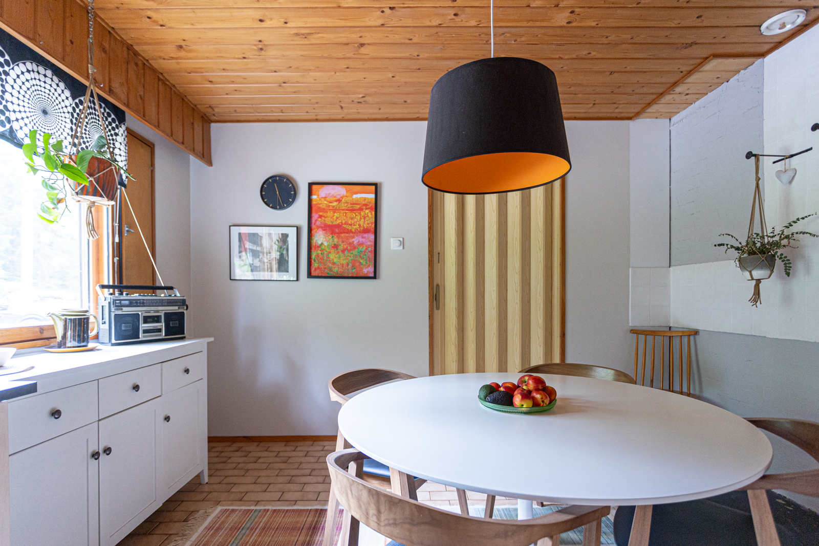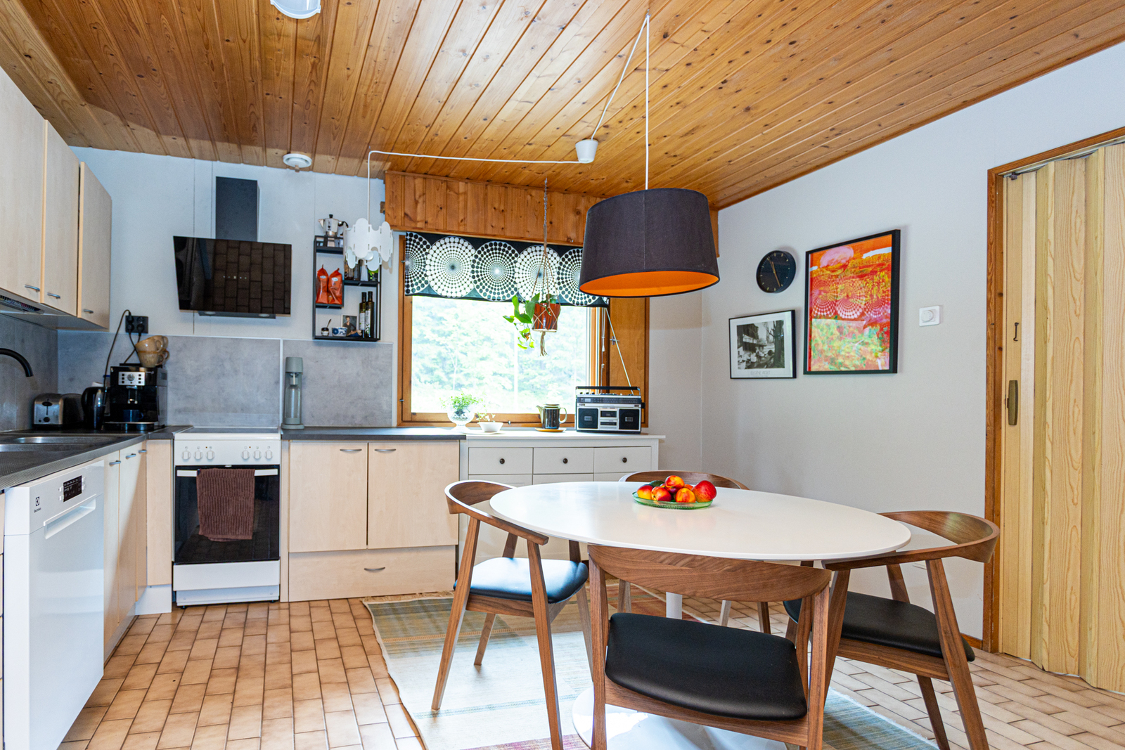 Keittiöön mahtuu hyvin ruokailuryhmä, vuolukiven takka antaa mukavasti lämpöä ja tunnelmaa taloon. Tilavassa kodinhoitohuoneessa pyykkihuolto hoituu helposti.