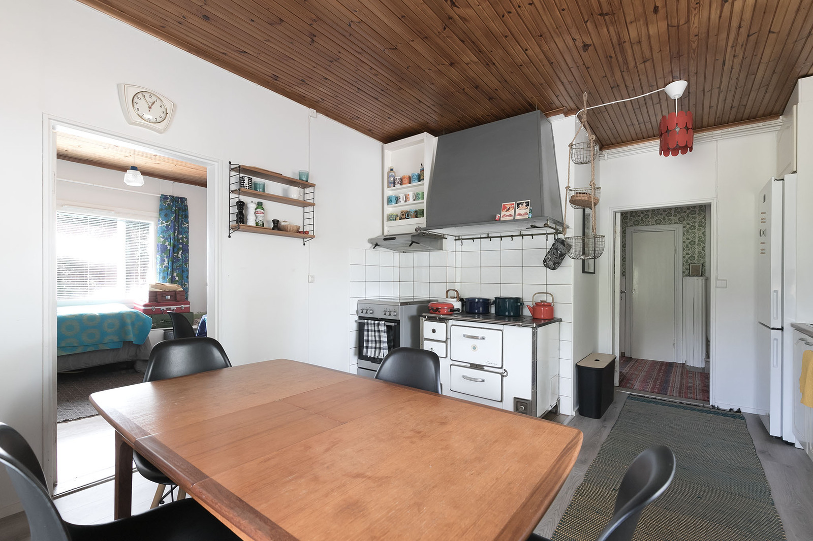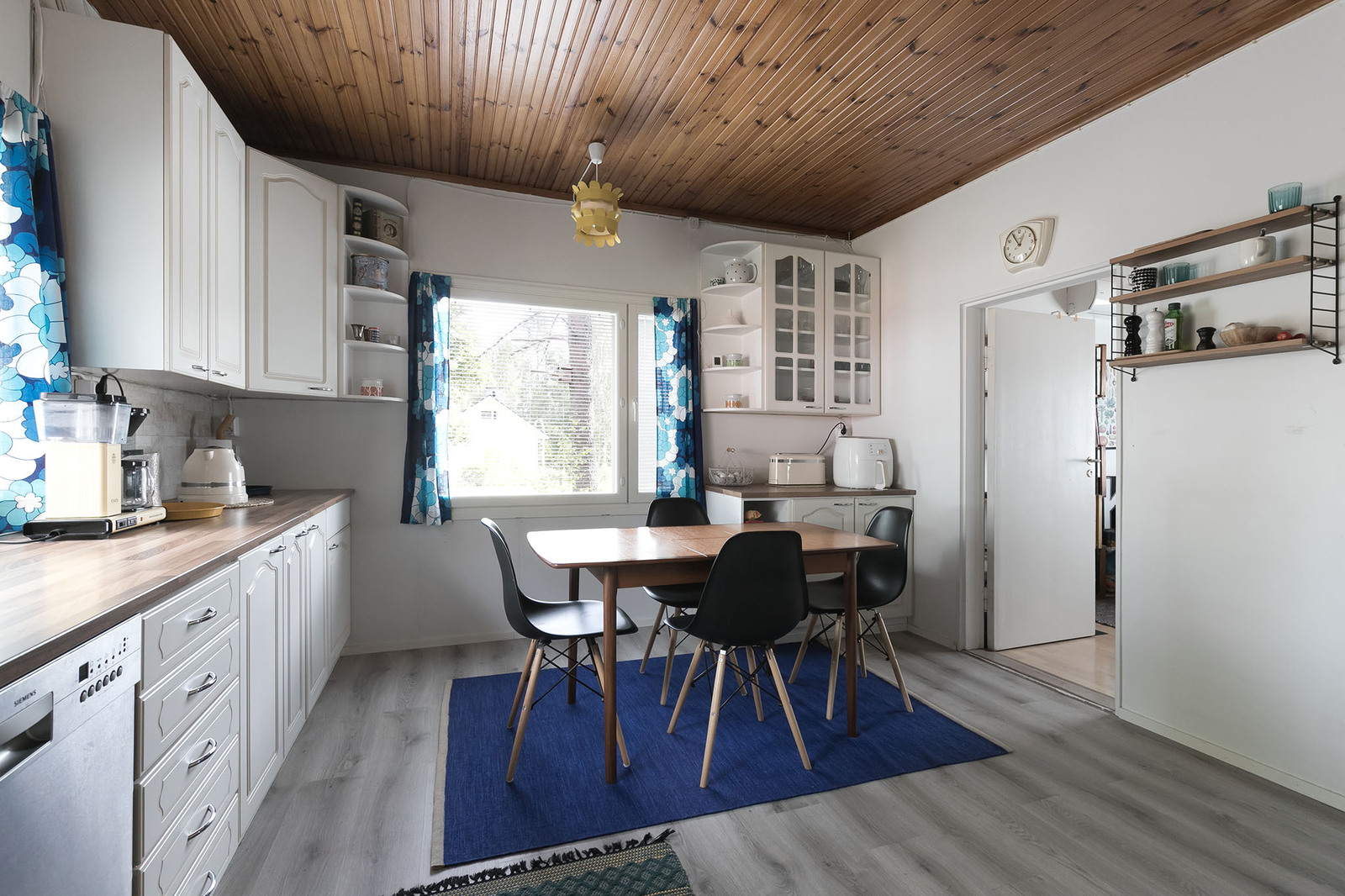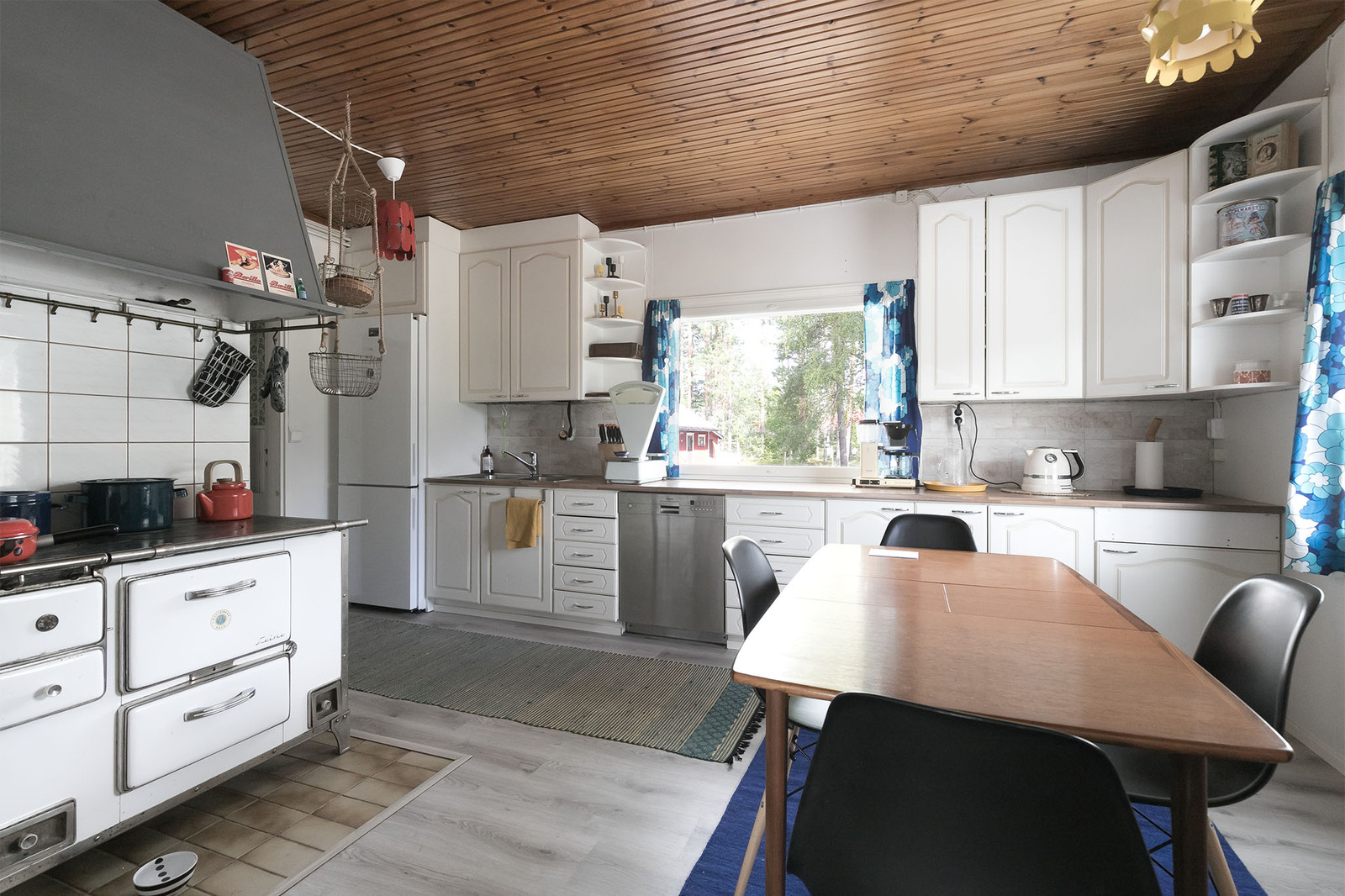 Liesi (Keraaminen liesi ja puuliesi), työtasot (laminaatti), seinät (maali), lattiat (vinyyli), liesi, liesituuletin, astianpesukone, jääkaappipakastin ja kiinteät valaisimet |
