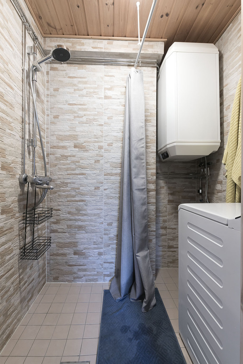 Pesukoneliitäntä, peili, lattialämmitys, suihku ja kiinteät valaisimet, seinät (kaakeli), lattiat (laatta) |