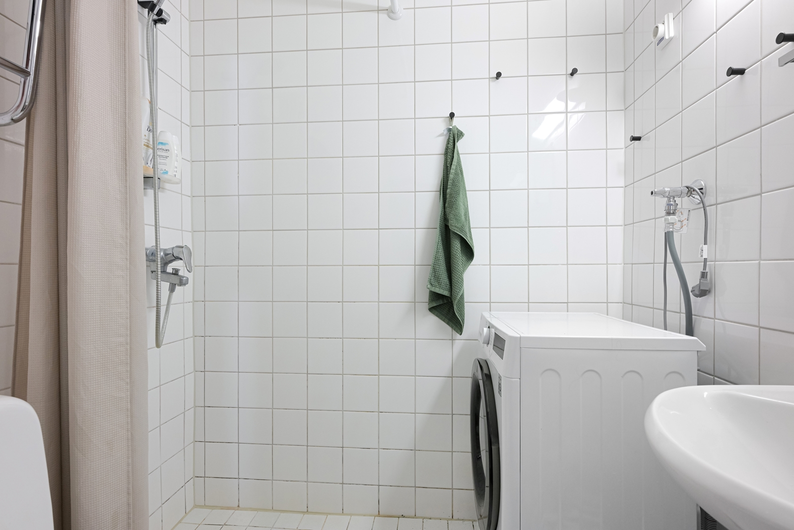| Kylpyhuoneen kuvaus | WC-istuin, suihku, pesukoneliitäntä ja pesuallas, seinät (kaakeli), lattiat (laatta) |