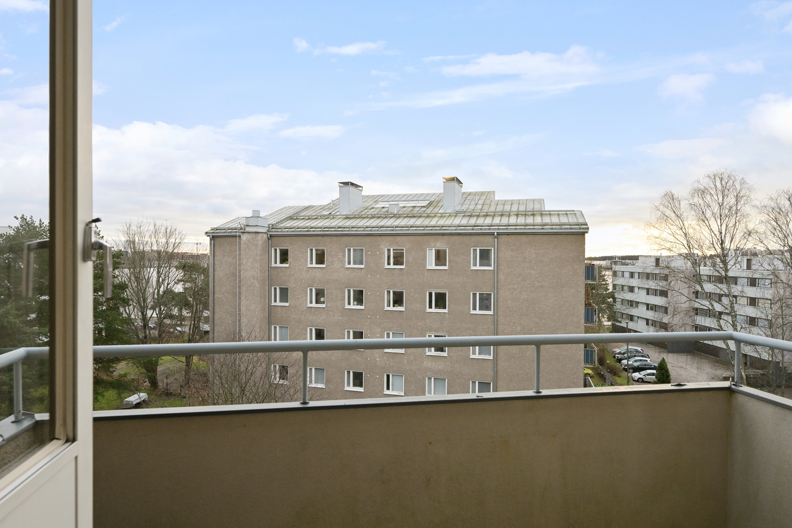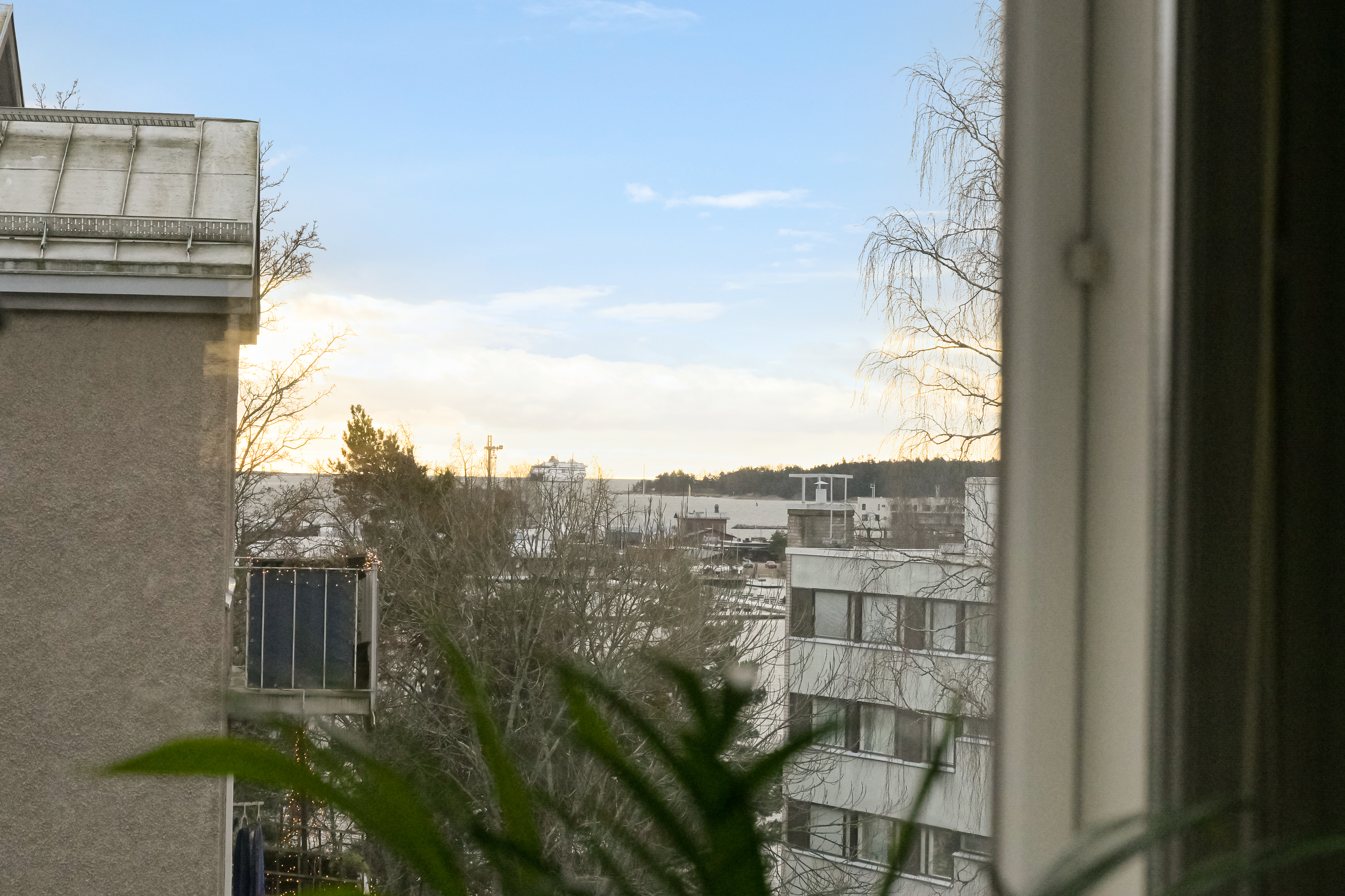 Tämä koti sijaitsee ylimmässä asuinkerroksessa ja sen parvekkeelta on merellisen rauhalliset näkymät. Puiden lomasta näkyy hienosti aina Lauttasaaren kärkeen asti, minkä ohi seilaa erilaisia vesikelpoisia aluksia.