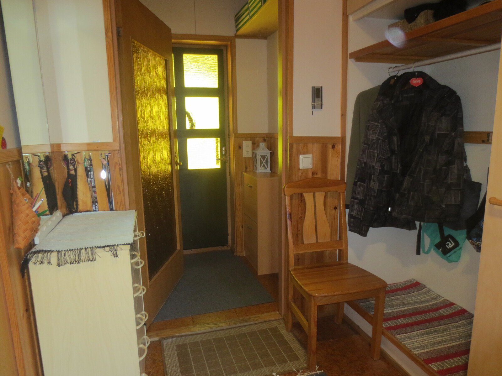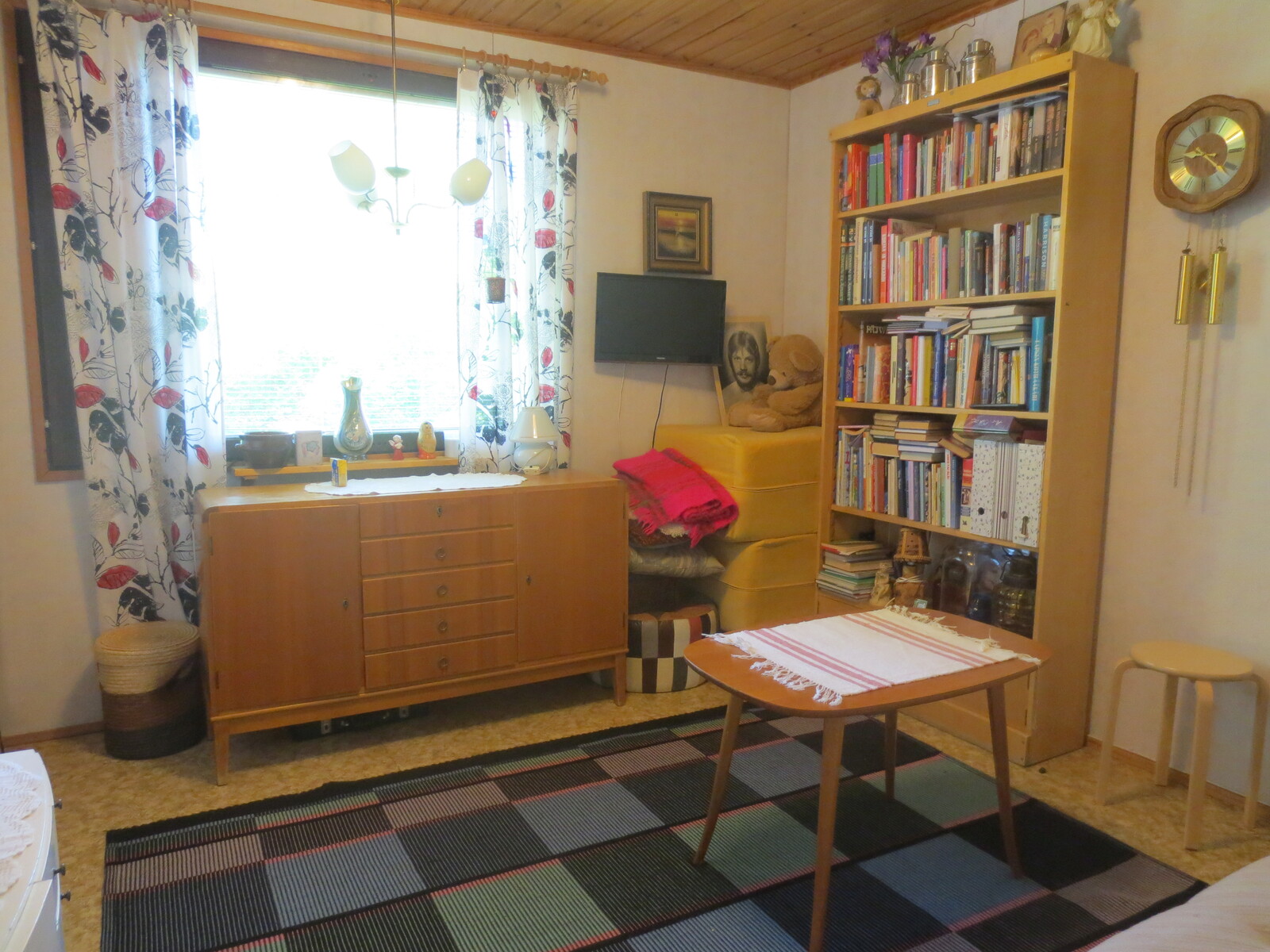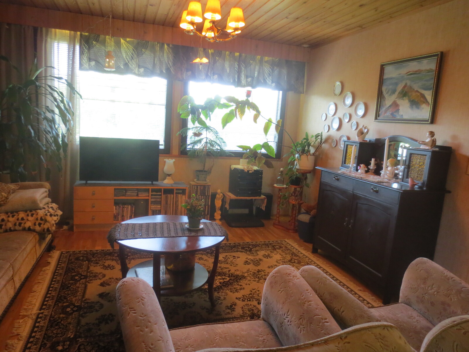 | Olohuoneen kuvaus | Seinät (puu ja tapetti), lattiat (parketti), lautapaneli katot |