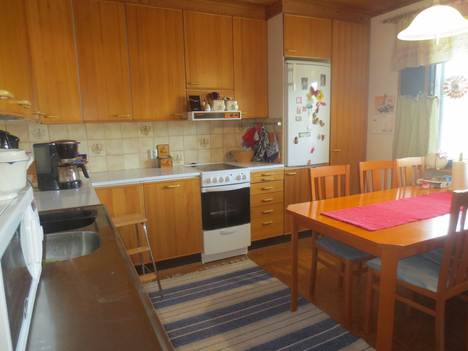 | Keittiön kuvaus | Liesi (Keraaminen liesi ja leivinuuni), työtasot (laminaatti), seinät (maali), lattiat (korkki), astianpesukone, erillinen pakastin, uuni, jääkaappi ja kiinteät valaisimet, liesituuletin / hormi |