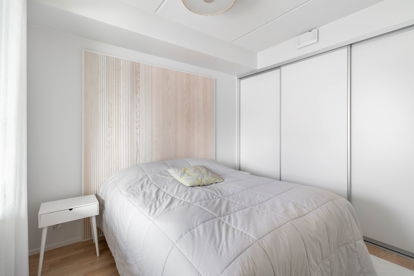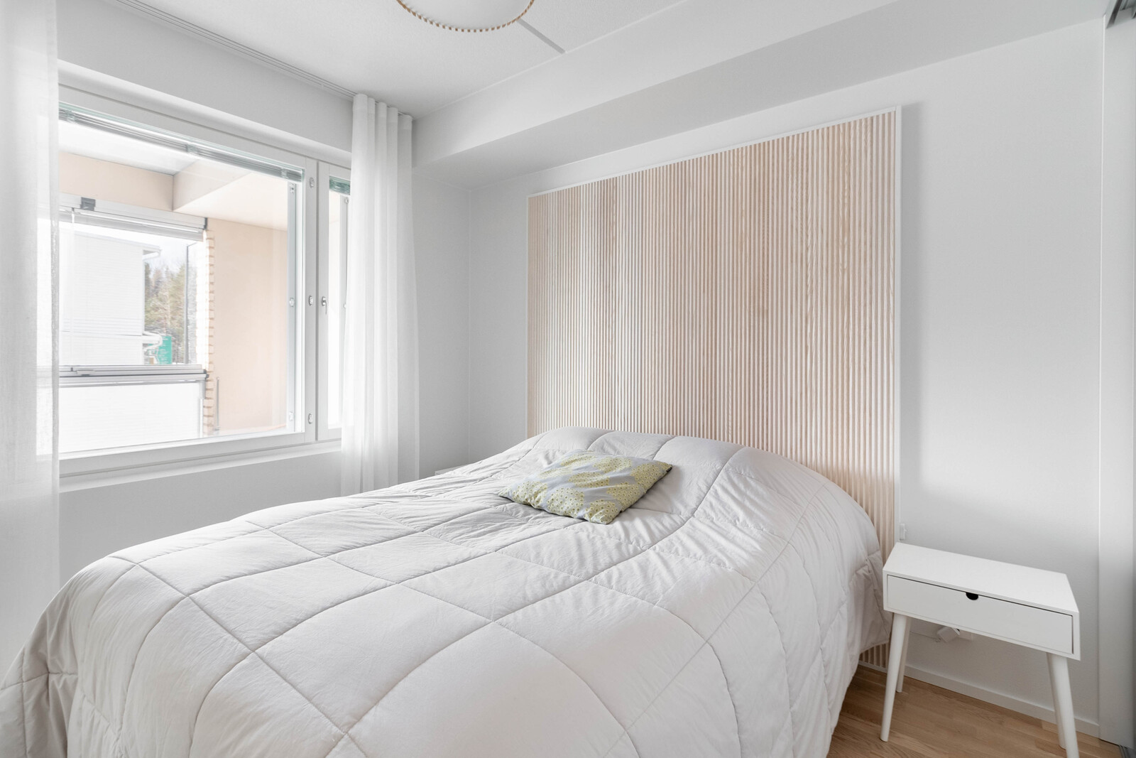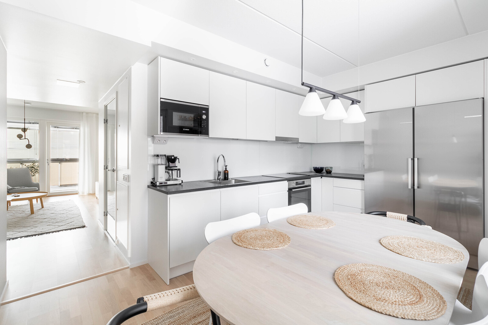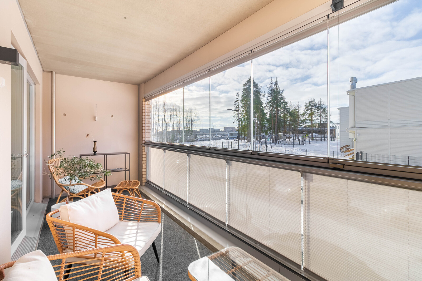 Asunnon tilavasta olohuoneesta avautuu käynti suurelle lasitetulle parvekkeelle – täydellinen paikka nauttia aamukahvista ja syksyn rauhallisista hetkistä. Keittiö on kotikokin unelma: vaaleat kaapistot, modernit kodinkoneet ja runsaasti tilaa luovuuden virtaamiseen ruoanlaiton parissa. Kaksi makuuhuonetta tarjoavat rauhalliset puitteet rentouttavaan uneen, ja molemmissa on käytännölliset liukuovikaapistot, jotka tuovat runsaasti säilytystilaa arkeen.