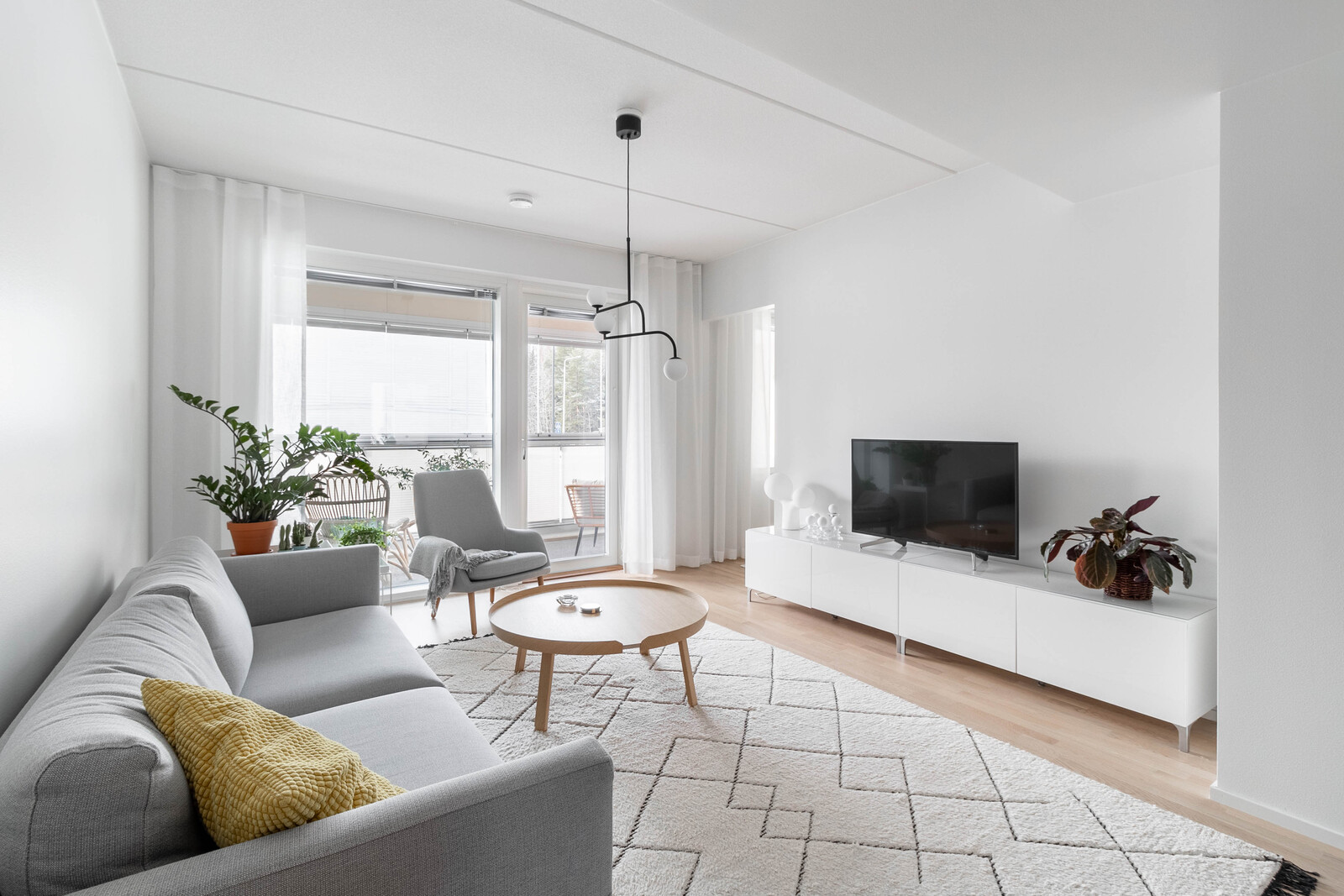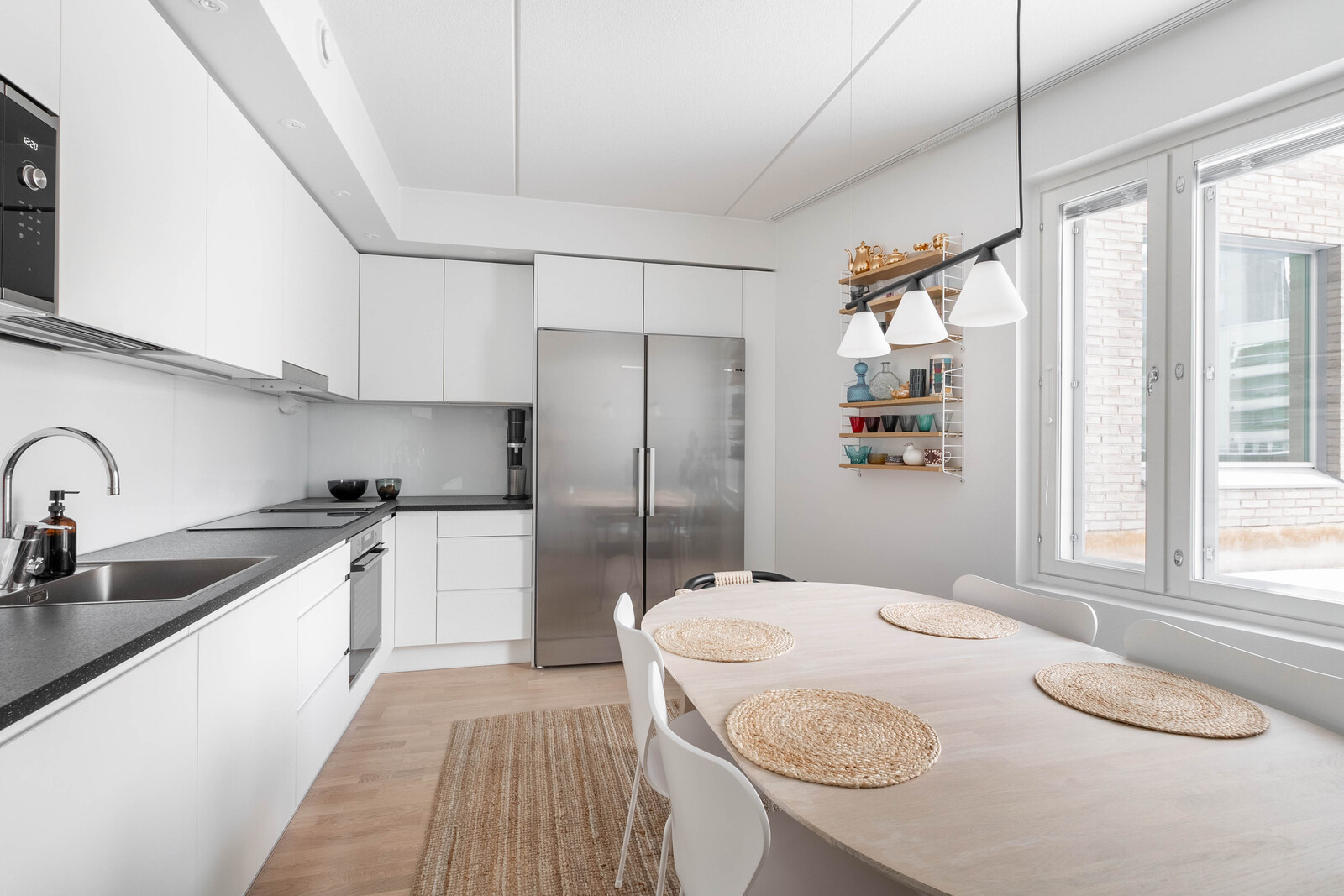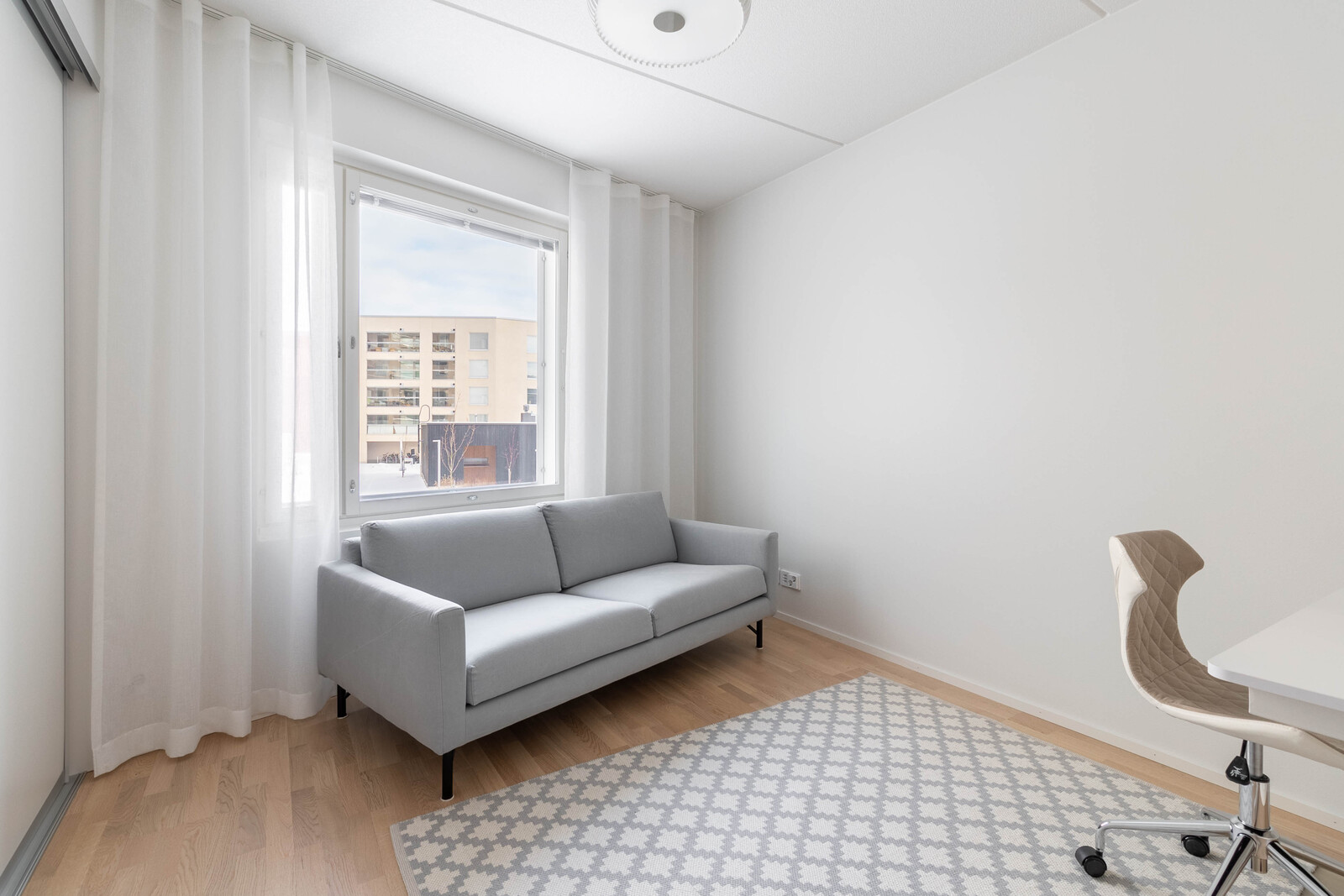 Asunnon tilavasta olohuoneesta avautuu käynti suurelle lasitetulle parvekkeelle – täydellinen paikka nauttia aamukahvista ja syksyn rauhallisista hetkistä. Keittiö on kotikokin unelma: vaaleat kaapistot, modernit kodinkoneet ja runsaasti tilaa luovuuden virtaamiseen ruoanlaiton parissa. Kaksi makuuhuonetta tarjoavat rauhalliset puitteet rentouttavaan uneen, ja molemmissa on käytännölliset liukuovikaapistot, jotka tuovat runsaasti säilytystilaa arkeen.