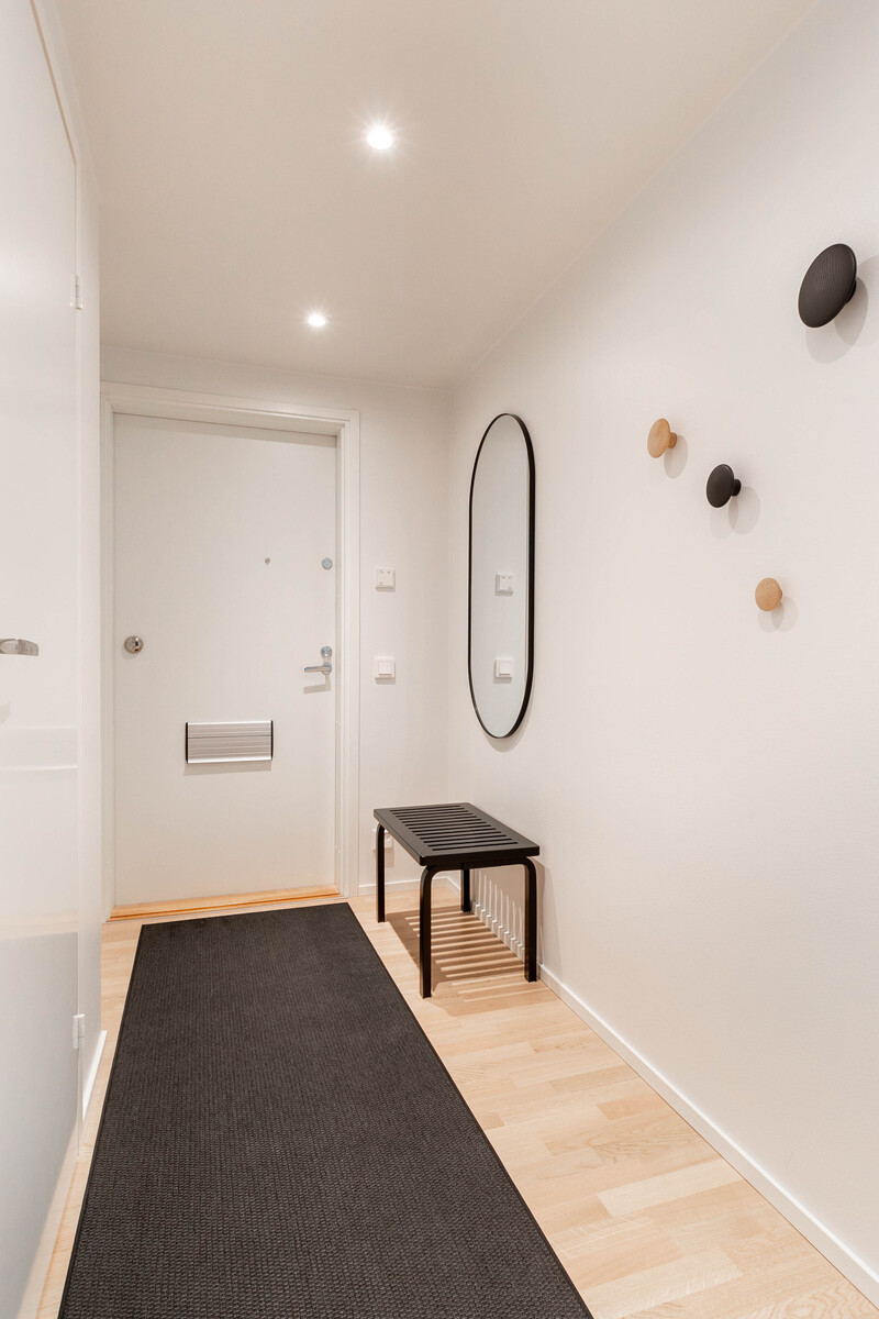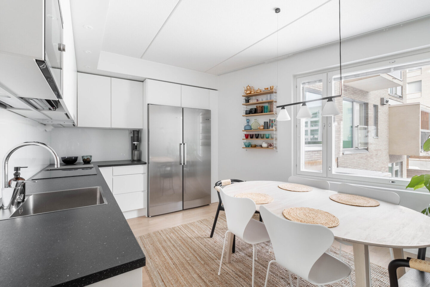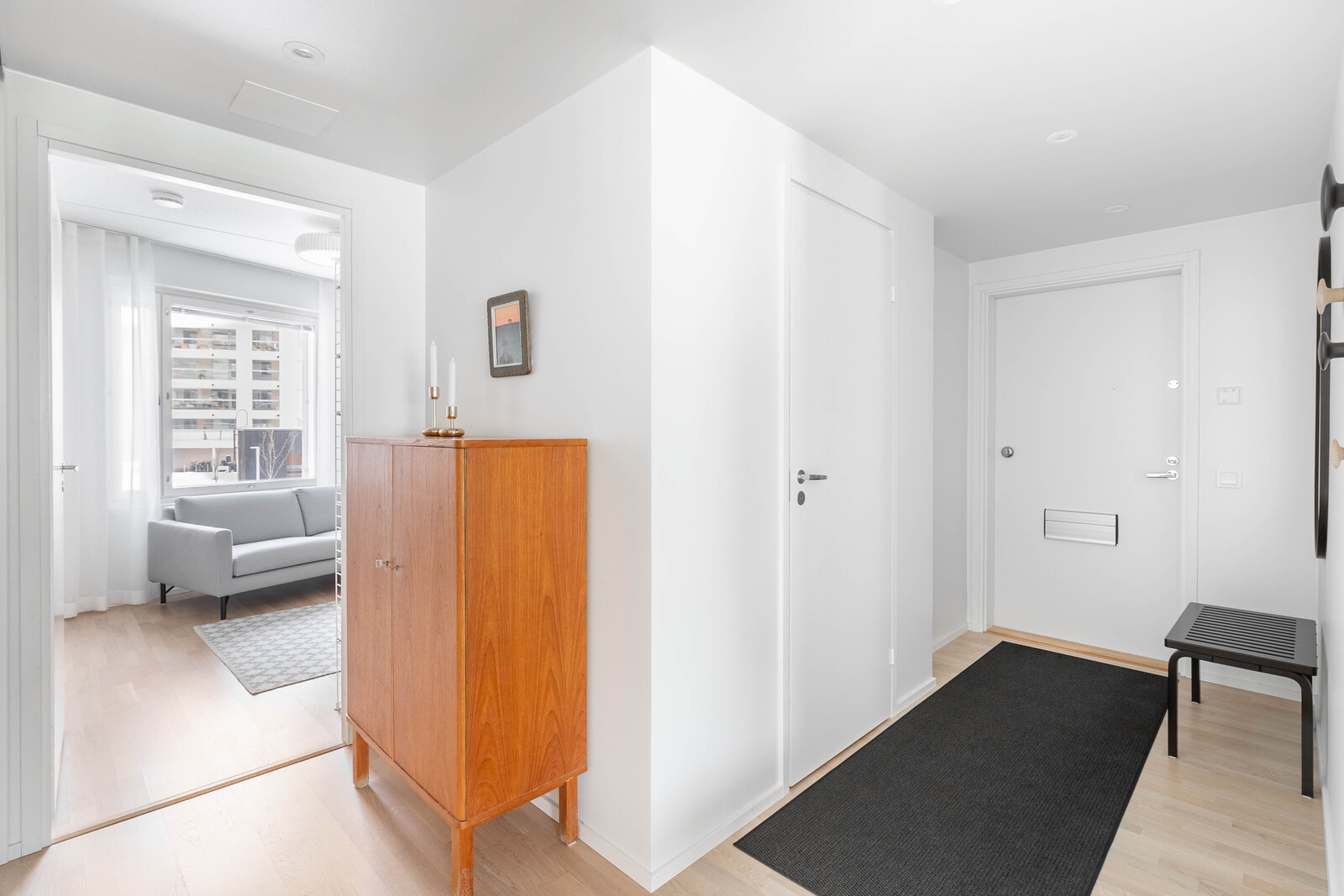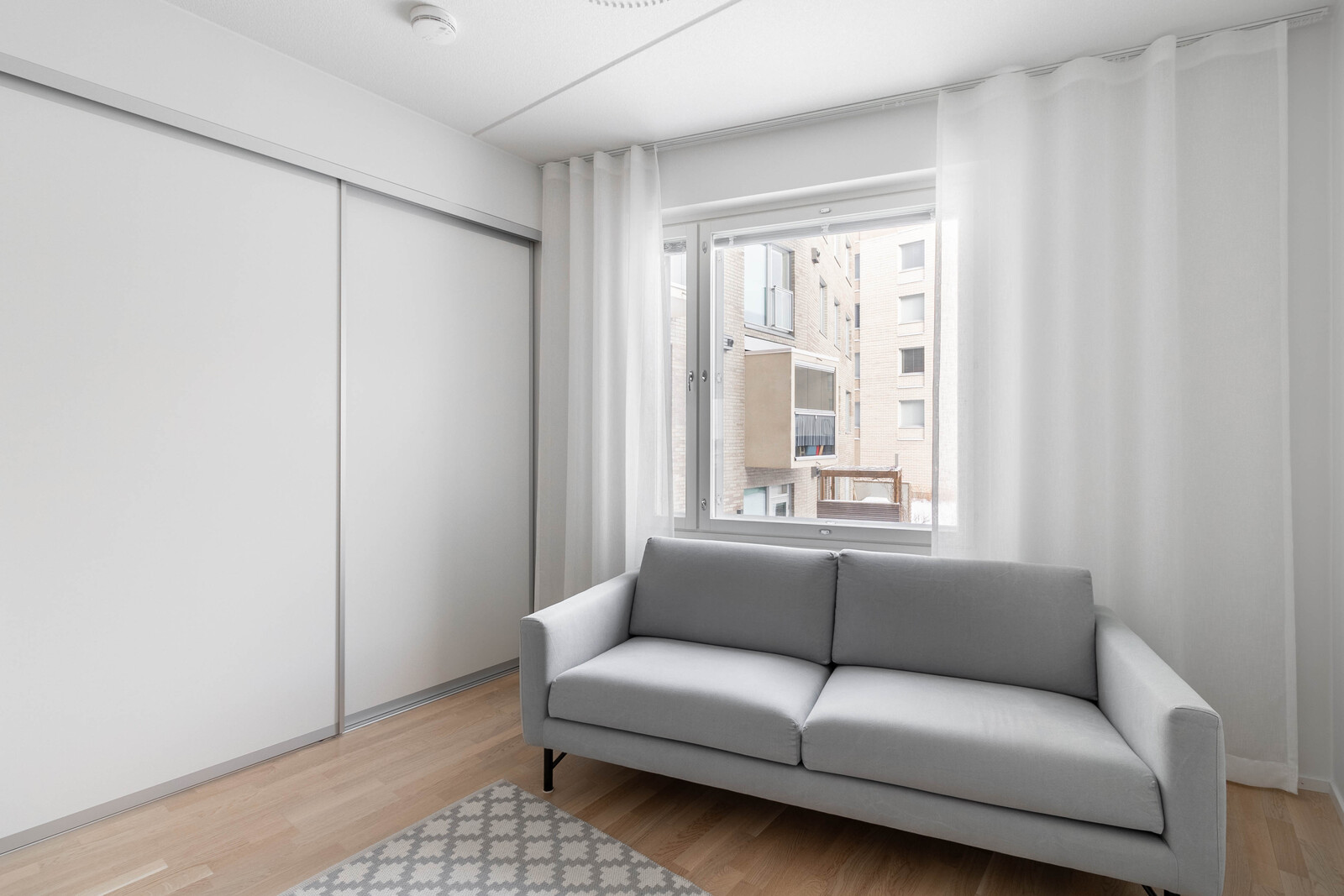 Asunnon tilavasta olohuoneesta avautuu käynti suurelle lasitetulle parvekkeelle – täydellinen paikka nauttia aamukahvista ja syksyn rauhallisista hetkistä. Keittiö on kotikokin unelma: vaaleat kaapistot, modernit kodinkoneet ja runsaasti tilaa luovuuden virtaamiseen ruoanlaiton parissa. Kaksi makuuhuonetta tarjoavat rauhalliset puitteet rentouttavaan uneen, ja molemmissa on käytännölliset liukuovikaapistot, jotka tuovat runsaasti säilytystilaa arkeen.