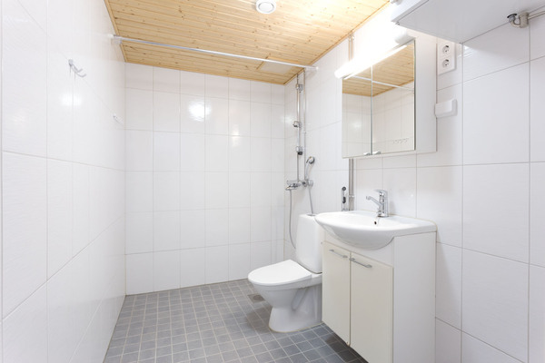 | Kylpyhuoneen kuvaus | Suihku, lattialämmitys, wc-istuin, peilikaappi, pesukoneliitäntä ja kiinteät valaisimet, lattiat (laatta) |