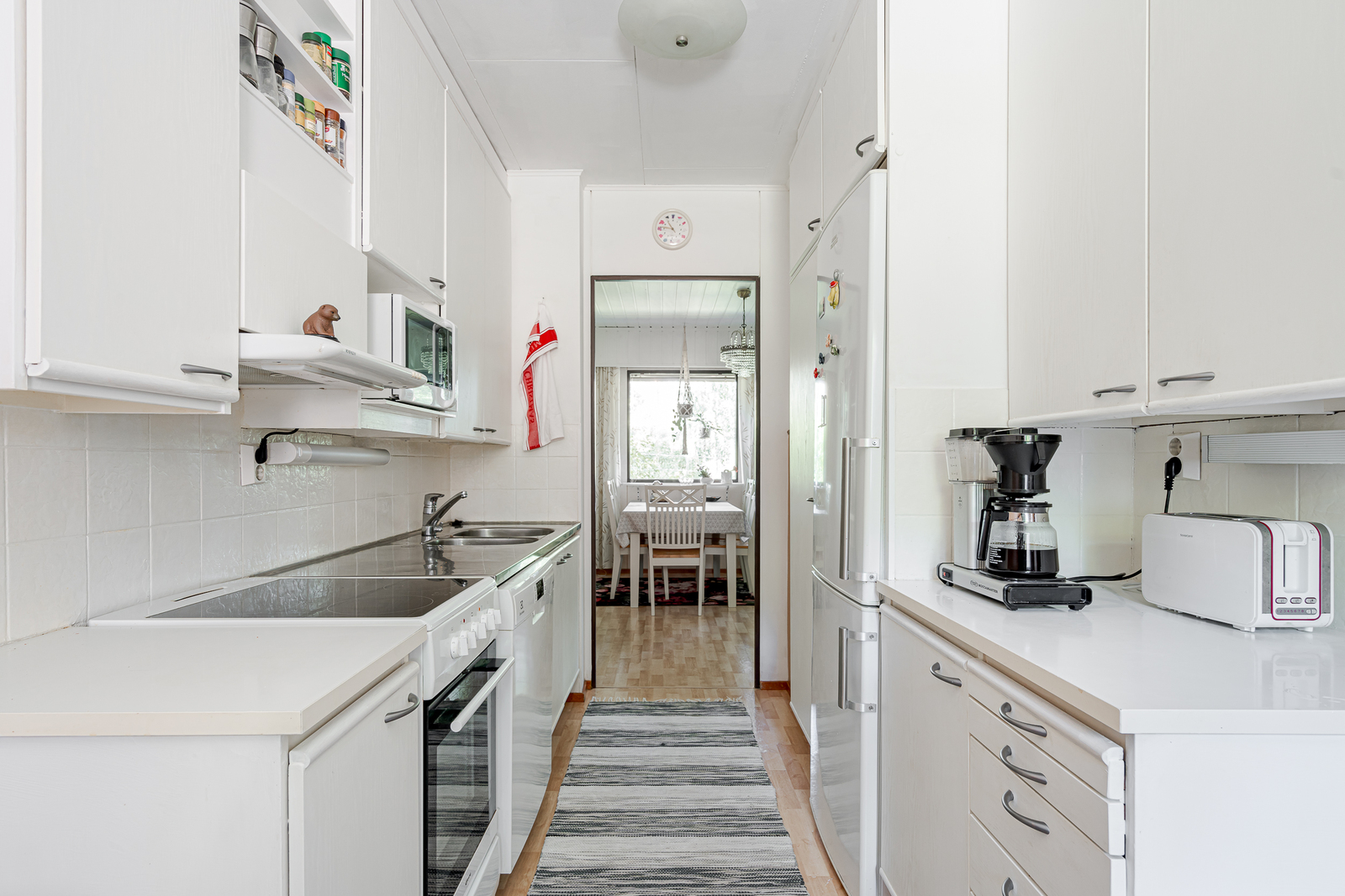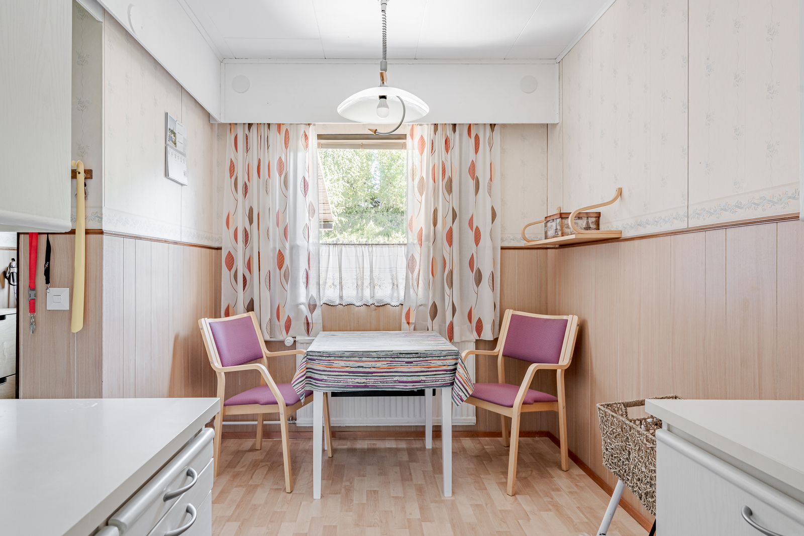 Liesi (Keraaminen liesi), seinät (tapetti ja osalaatoitus, puolipaneeli), lattiat (muovimatto), liesituuletin ja jääkaappipakastin |