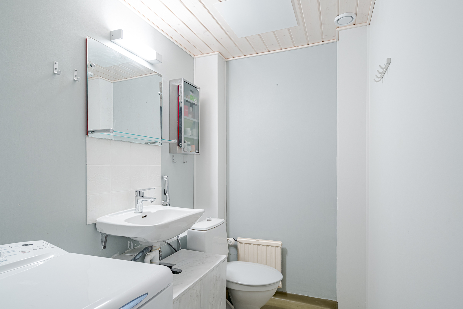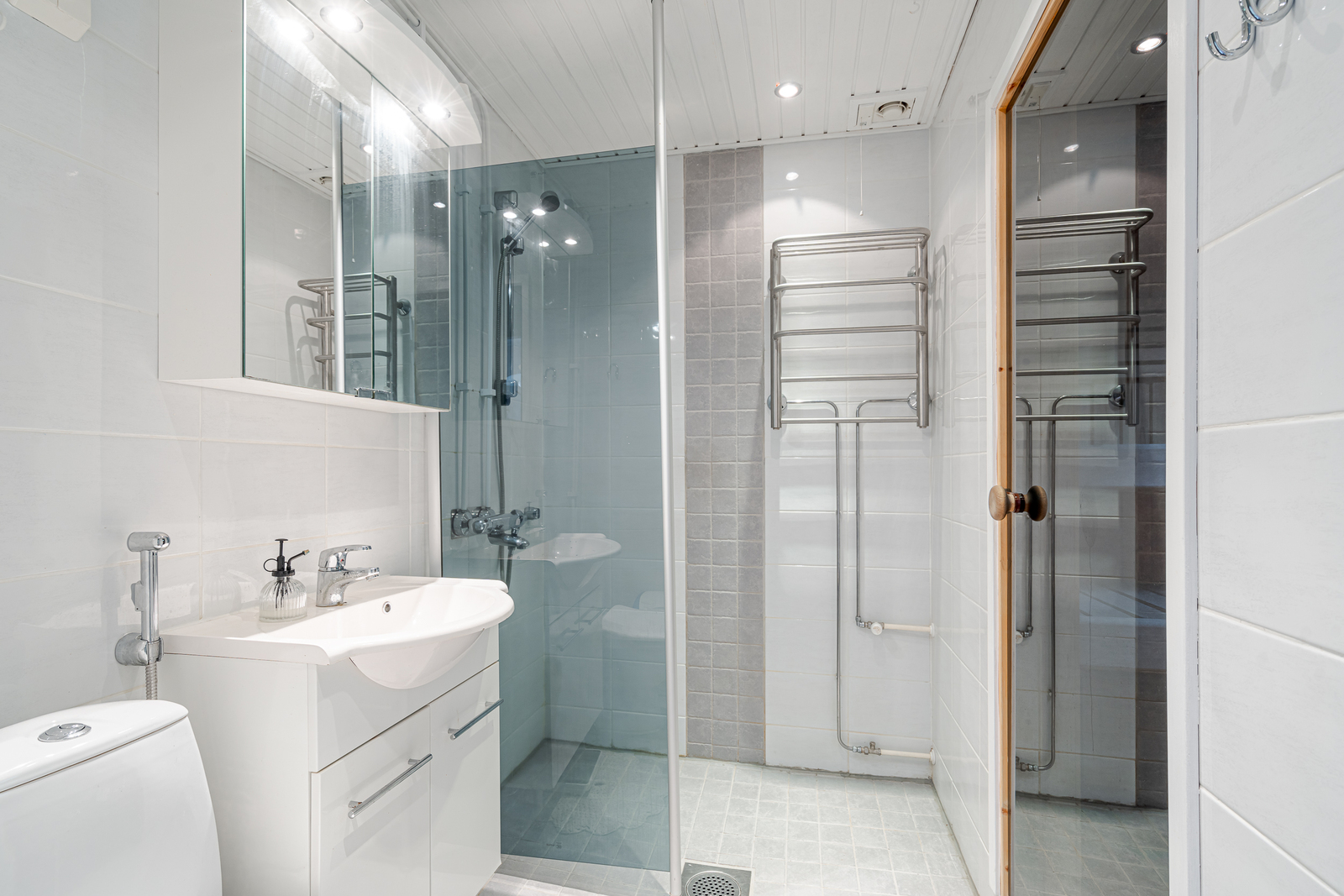 Allaskaappi, wc-istuin, suihkuseinä, lattialämmitys, suihku ja kiinteät valaisimet, seinät (kaakeli), lattiat (laatta) |
