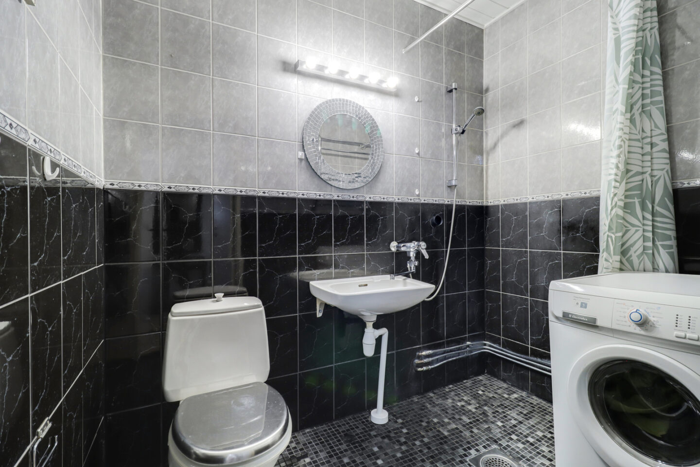 | Kylpyhuoneen kuvaus | Suihku, peili, pesukoneliitäntä, wc-istuin ja kiinteät valaisimet, seinät (kaakeli), lattiat (laatta) |