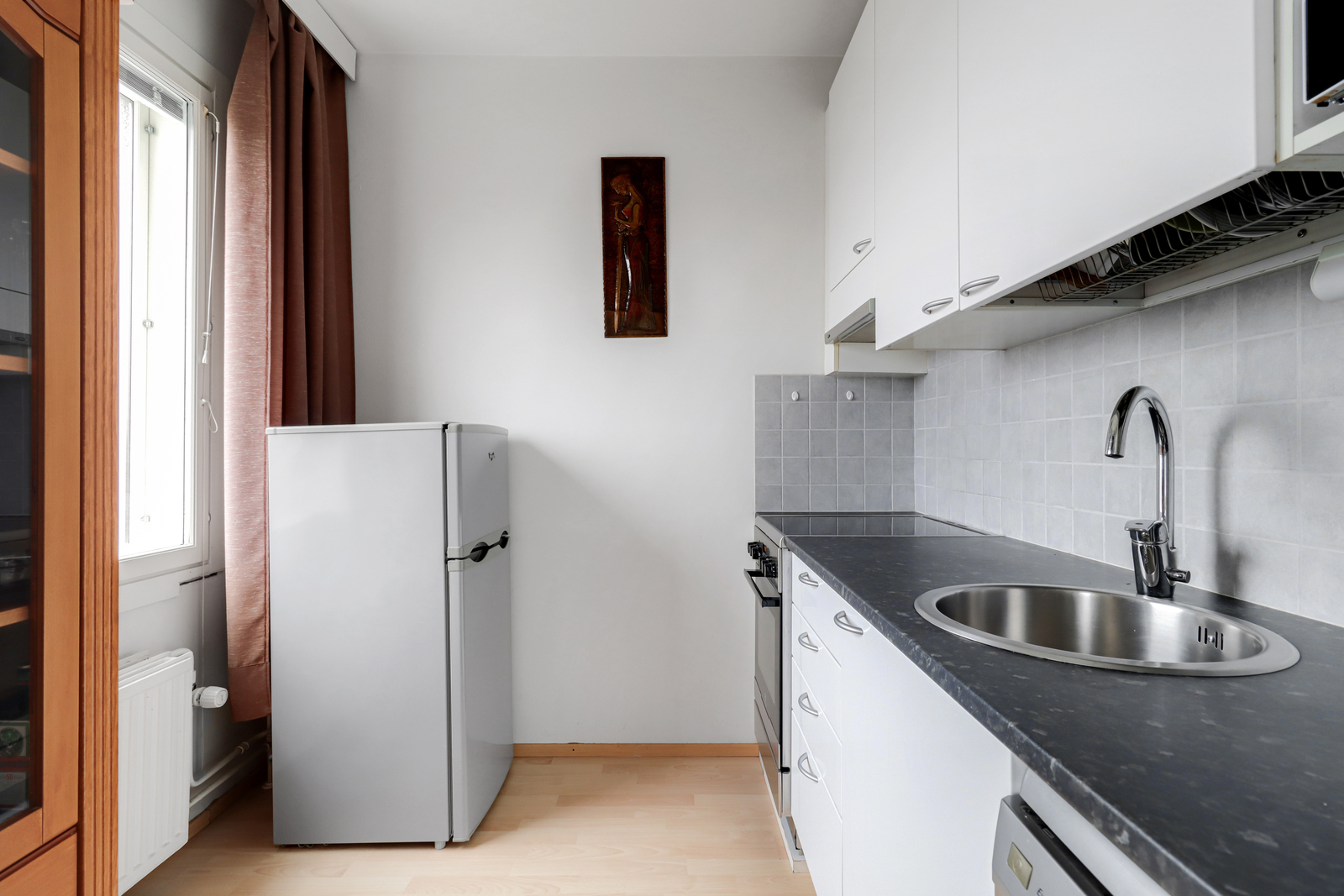 Tilava, ikkunallinen keittokomero, jossa on toimiva keittiökaapisto kodinkoneineen.