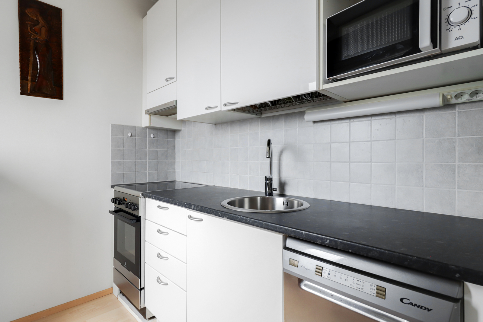 | Keittiön kuvaus | Liesi (Keraaminen liesi), astianpesukone (rosteri), liesituuletin (rosteri), jenkkikaappi (harmaa) ja kiinteät valaisimet, Kiiltovalkoinen keittiökaapisto |