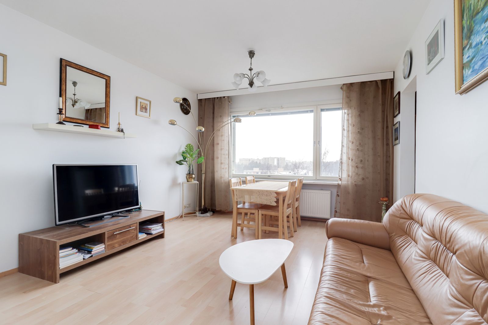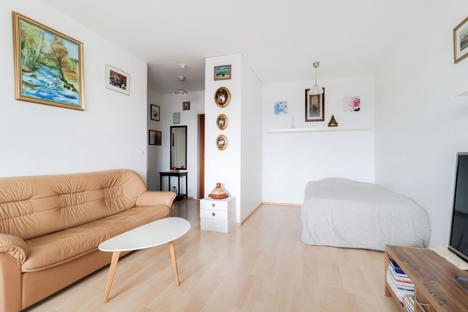Olohuoneessa on alkovi, joka luo makuutilalle rauhaa ja helpottaa tilan sisustamista.