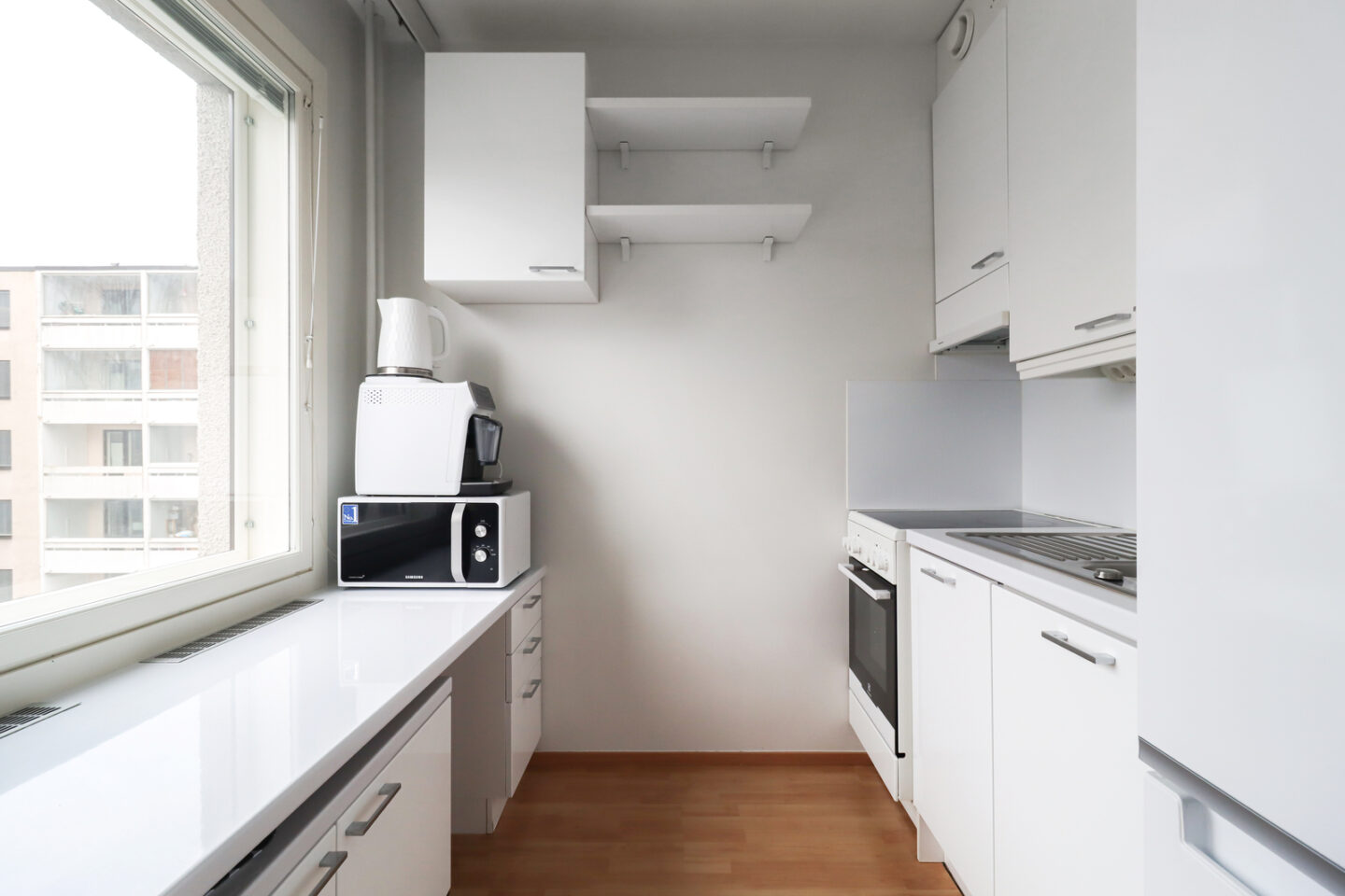 Tilava, ikkunallinen keittokomero, jonka trendikäs keittiökaapisto tarjoaa runsaasti säilytys- ja laskutilaa.
