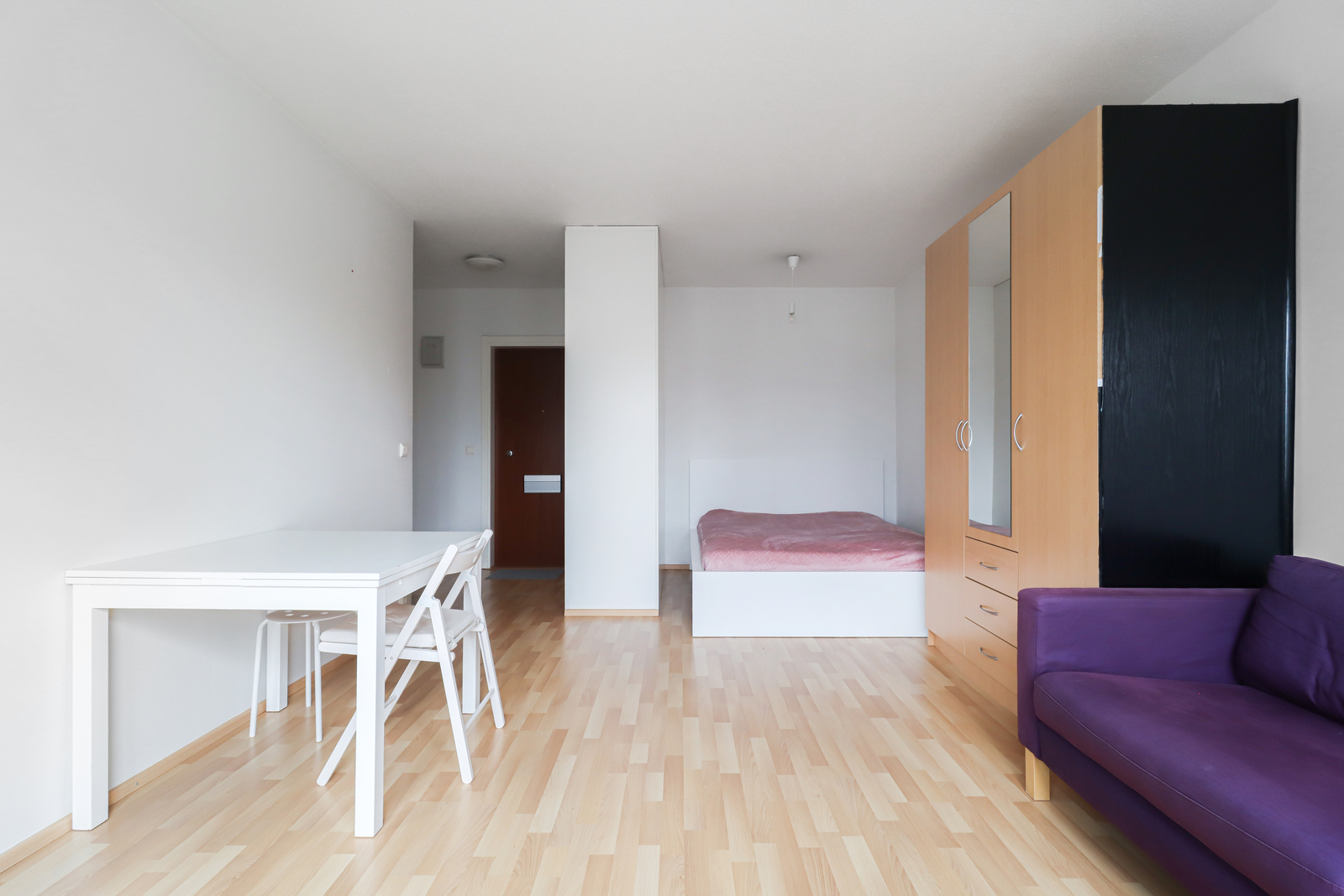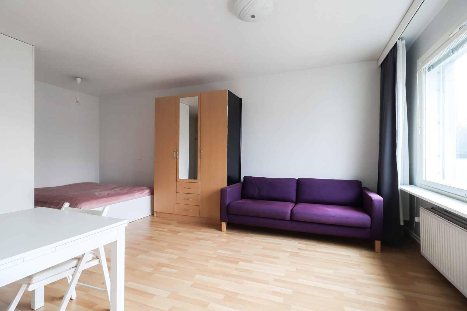 Olohuoneessa on alkovi, joka luo makuutilalle rauhaa ja helpottaa tilan sisustamista.