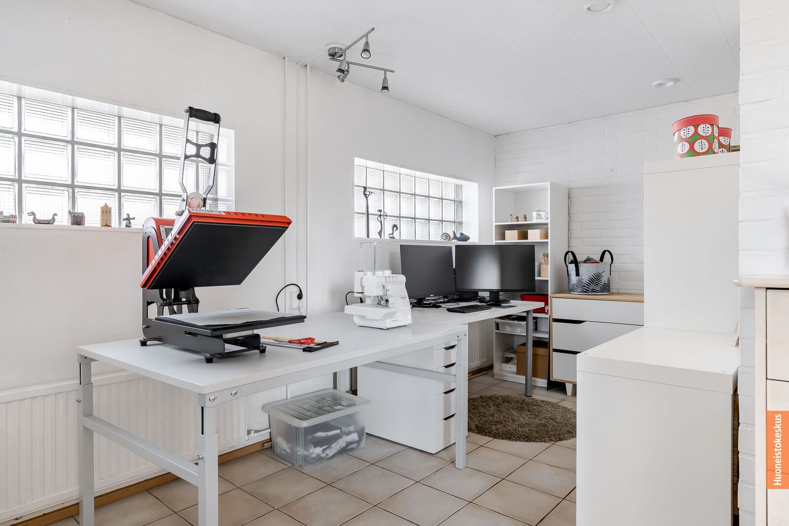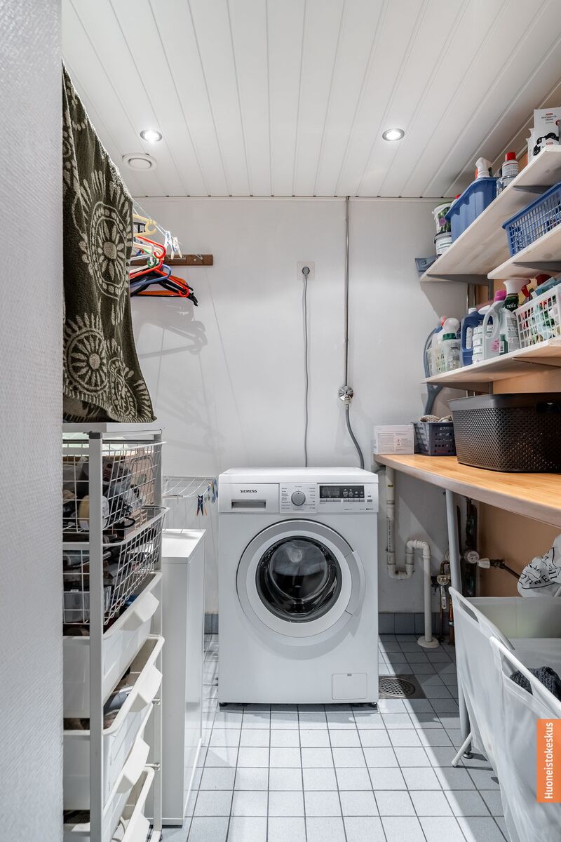 | Kodinhoitohuoneen kuvaus | Pesukoneliitäntä, lattiat (laatta), seinät (maali), Pesukoneliitäntä, pöytätaso ja hyllyt |