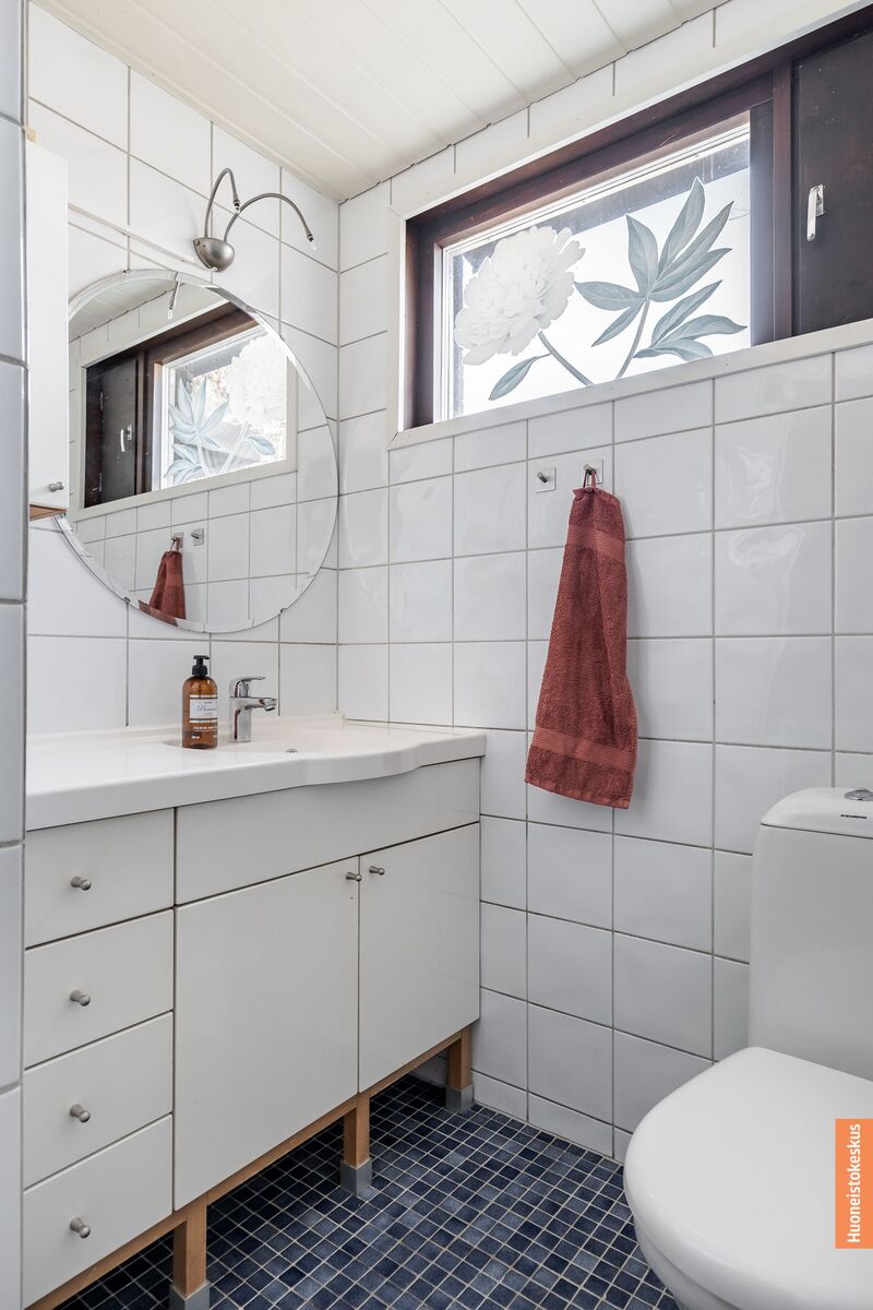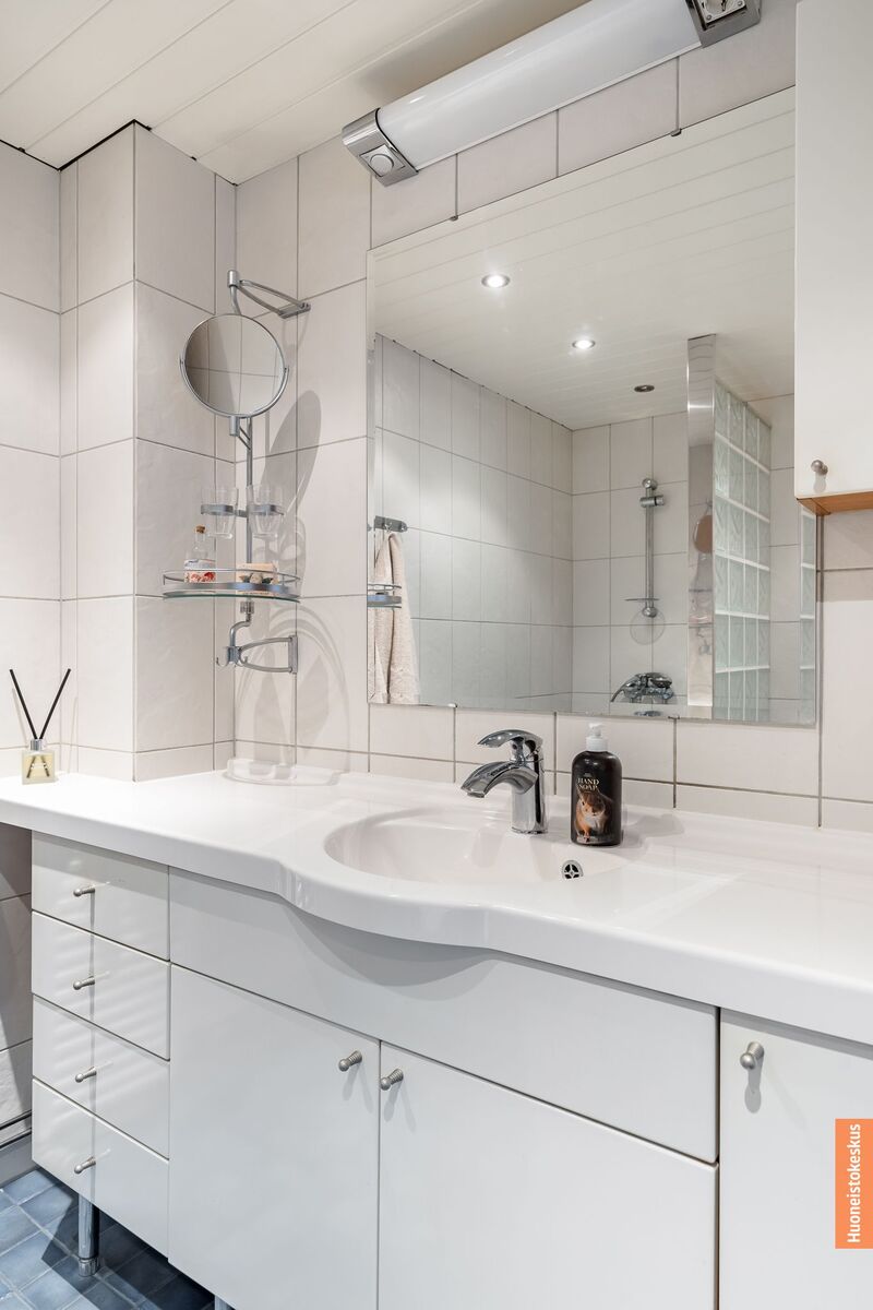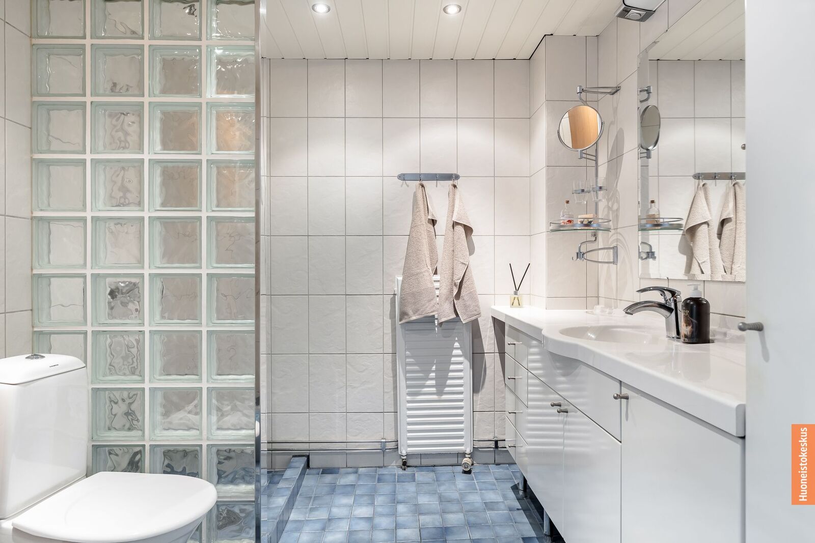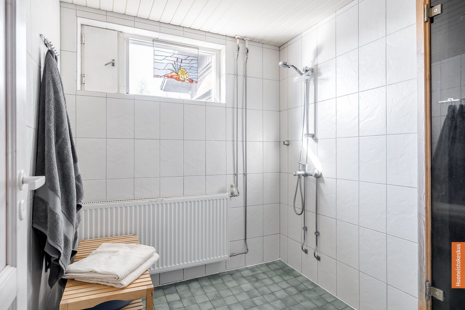 | Kylpyhuoneen kuvaus | Suihku ja kiinteät valaisimet, seinät (kaakeli), lattiat (laatta) |