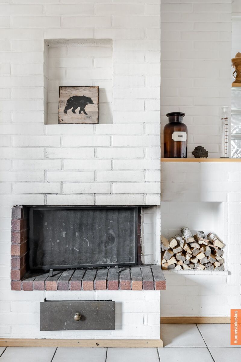 | Olohuoneen kuvaus | Lattia laminaattia ja takan edessä laattaa. Seinissä yhdellä seinällä tiiltä, muut maalattu. |