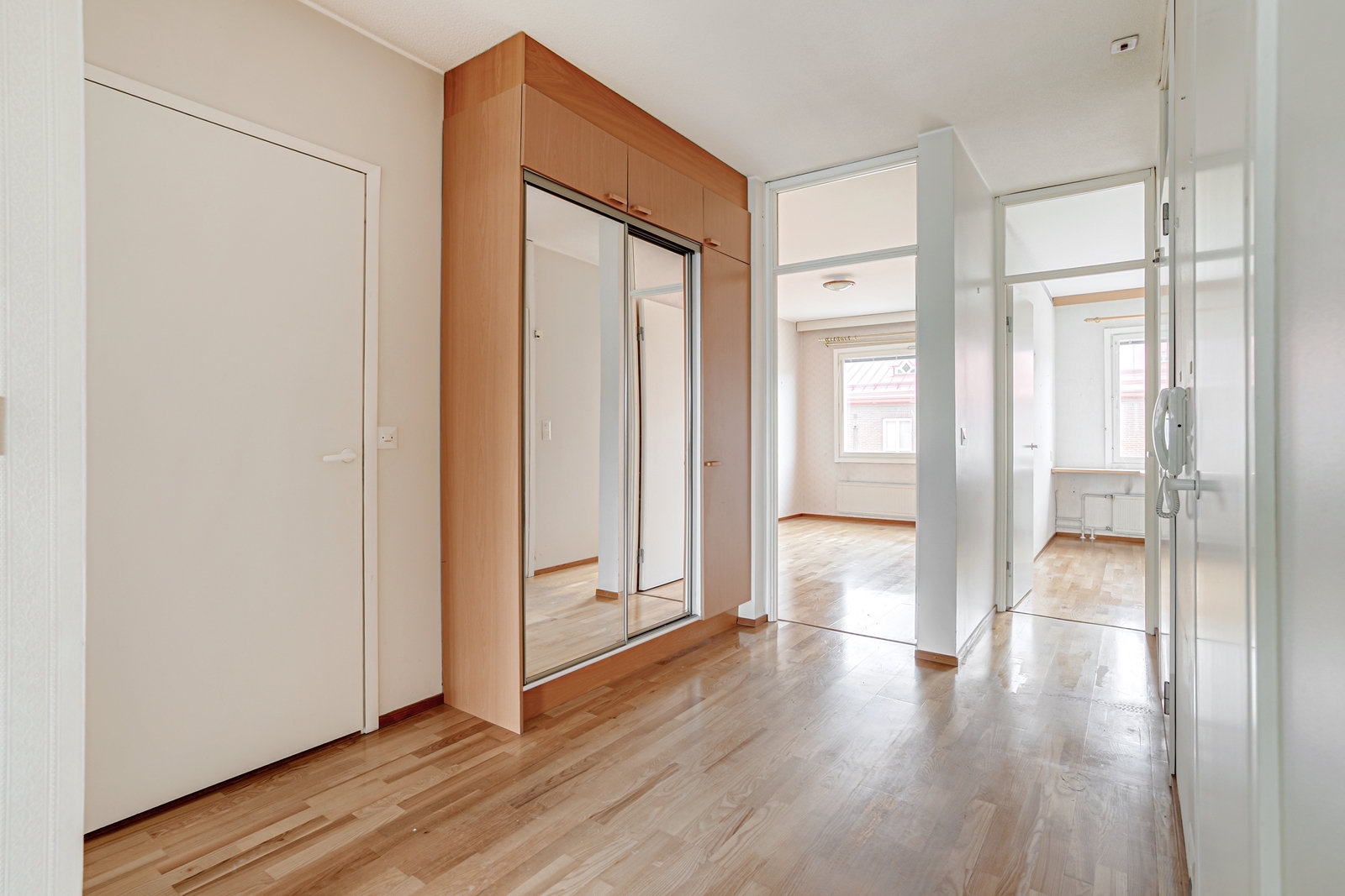Kaksi tilavaa vaatehuonetta tuovat mukavasti säilytystilaa ja tekevät arjesta sujuvaa. Pintaremontilla tästä saa pitkäaikaisen kodin, joka mukautuu helposti omiin tarpeisiin ja tyyliin.