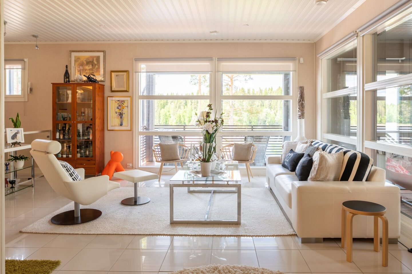 | Olohuoneen kuvaus | Seinät (maali ja tapetti), lattiat (laatta), – vaalea suurikokoinen lattialaatta – suuret ikkunapinnat upeilla järvimaisemilla |